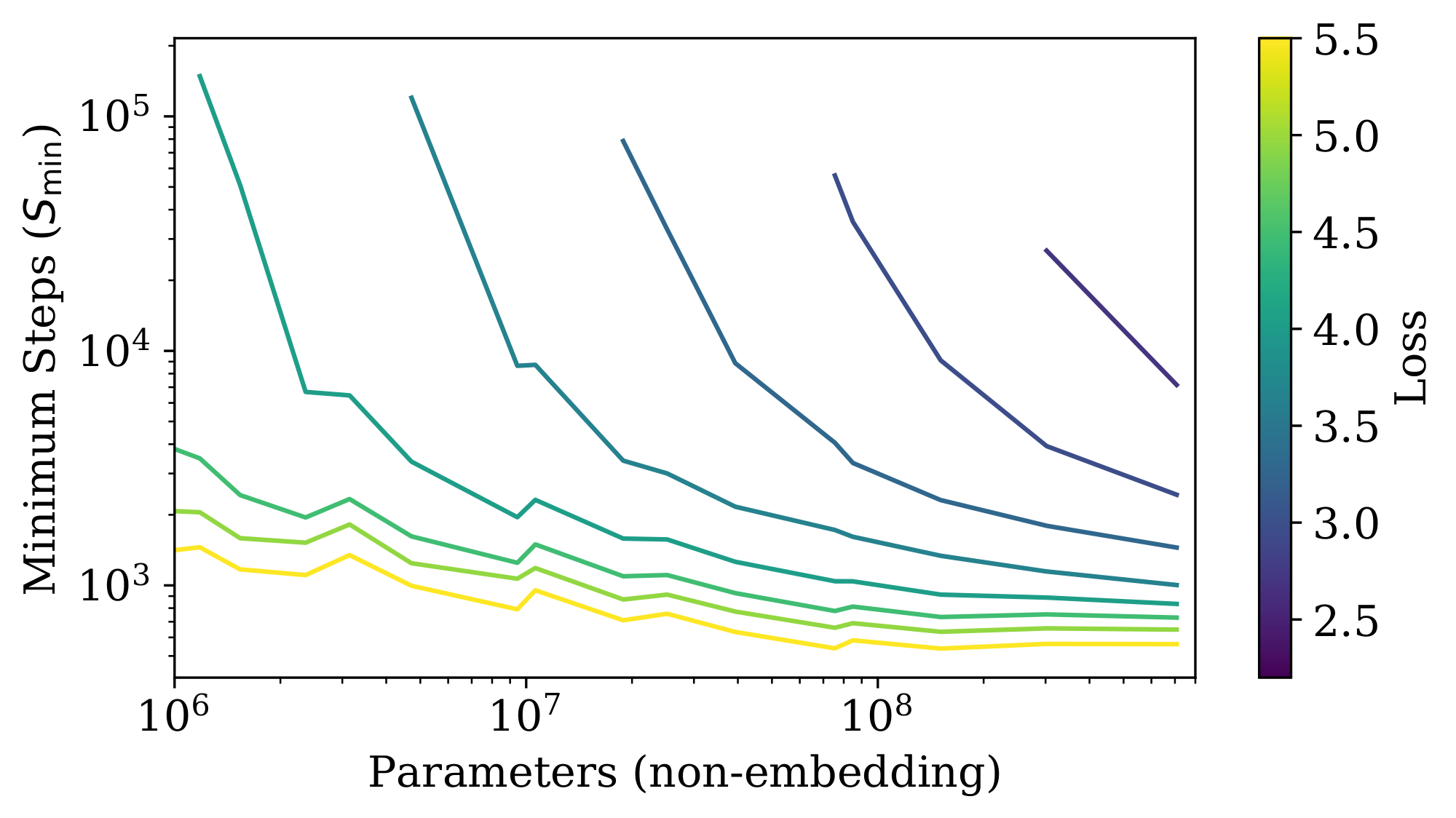 Figure 19: The number of minimum serial steps needed to reach any fixed value of the test loss decreases precipitously with model size. Sample efficiency (show here for training far below the critical batch size) improves greatly as well, improving by a factor of almost 100 when comparing the smallest possible model to a very large one. ::::