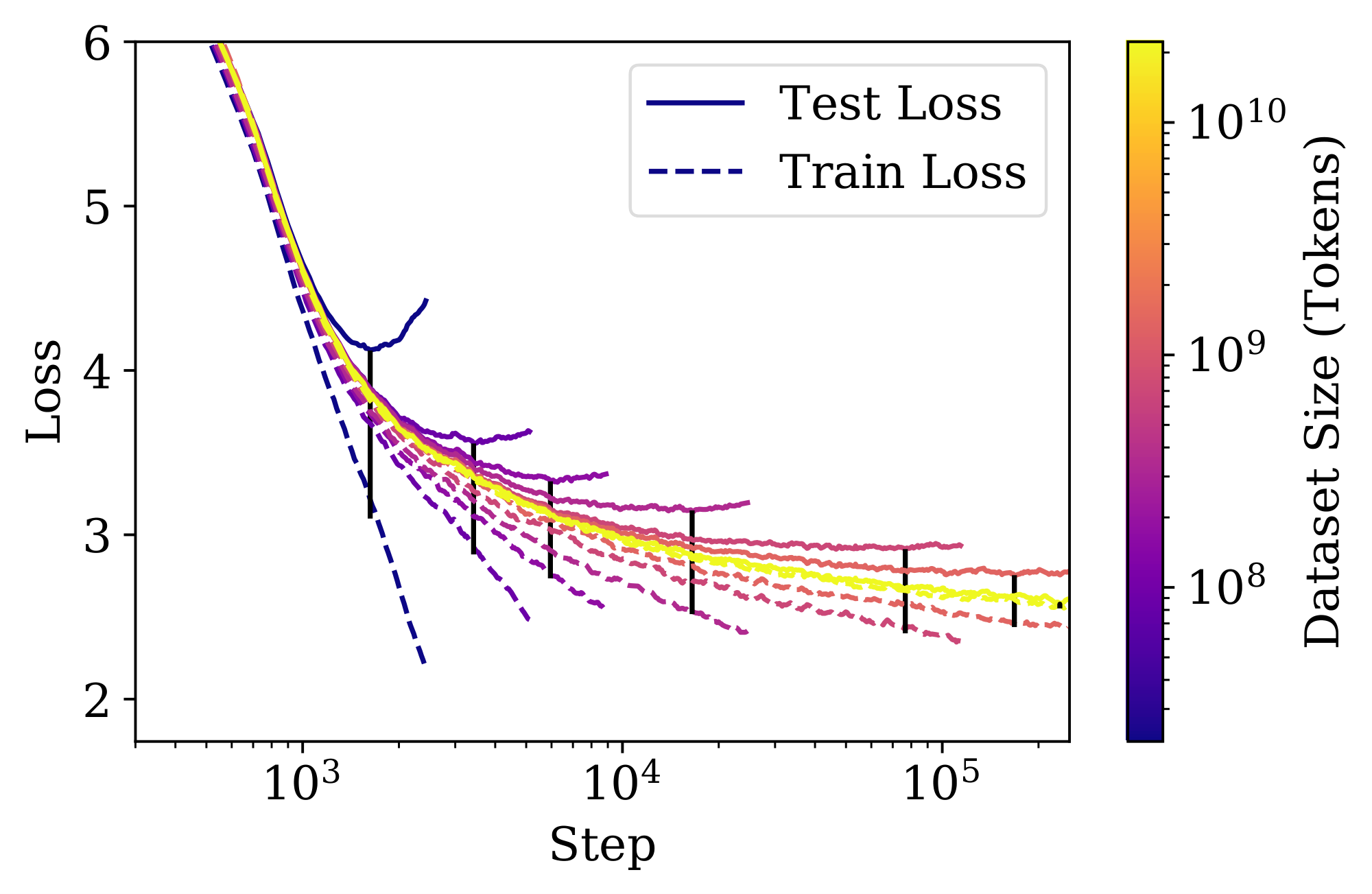 Figure 16: Left: We characterize the step on which early stopping occurs, as a function of the extent of overfitting. The red line indicates a lower bound for early stopping that is derived in Section 5.3. Right: We display train and test loss for a series of 300M parameter models trained on different sized dataset sub-samples. The test loss typically follows that of a run done with unrestricted data until diverging. Note that the degree of overfitting (as compared to the infinite data limit) is significantly overestimated by $L_{\rm test} - L_{\rm train}$ (denoted by a black bar for each run). ::::