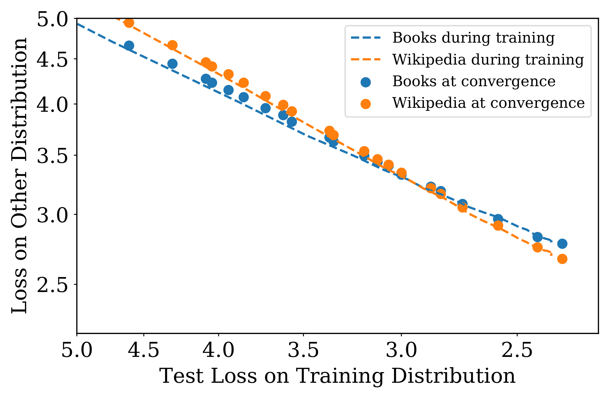When we evaluate models on text with a different distribution than they were trained on, the results are strongly correlated to those on the training validation set with a roughly constant offset in the loss – in other words, transfer to a different distribution incurs a constant penalty but otherwise improves roughly in line with performance on the training set. (Section 3.2.2)