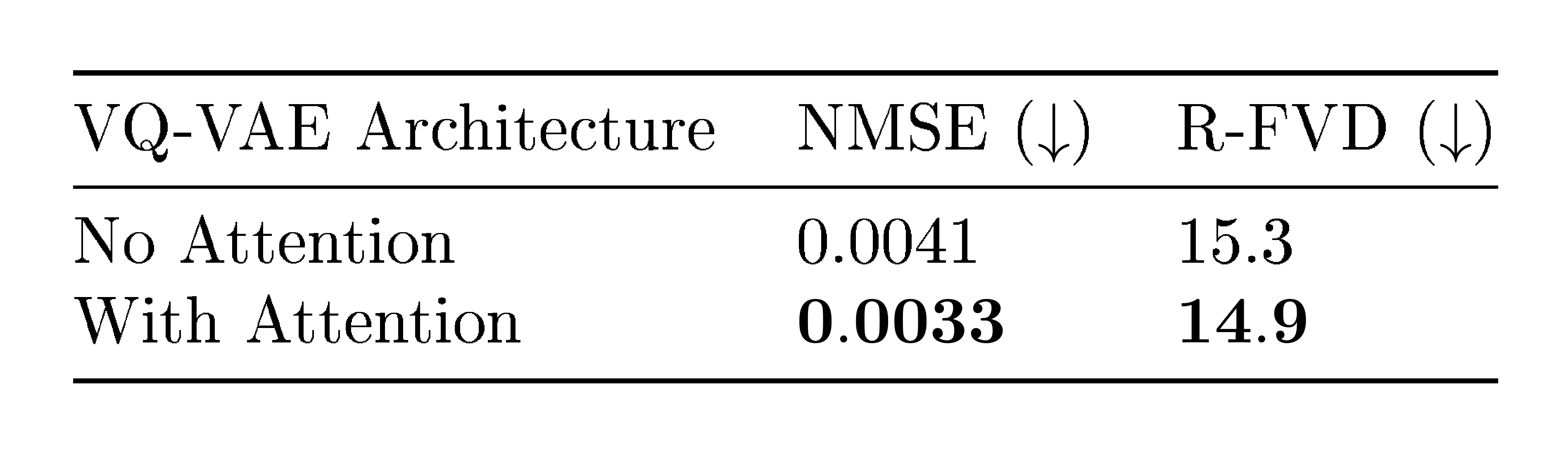 Table 3: Ablation on attention in VQ-VAE. R-FVD is with reconstructed examples