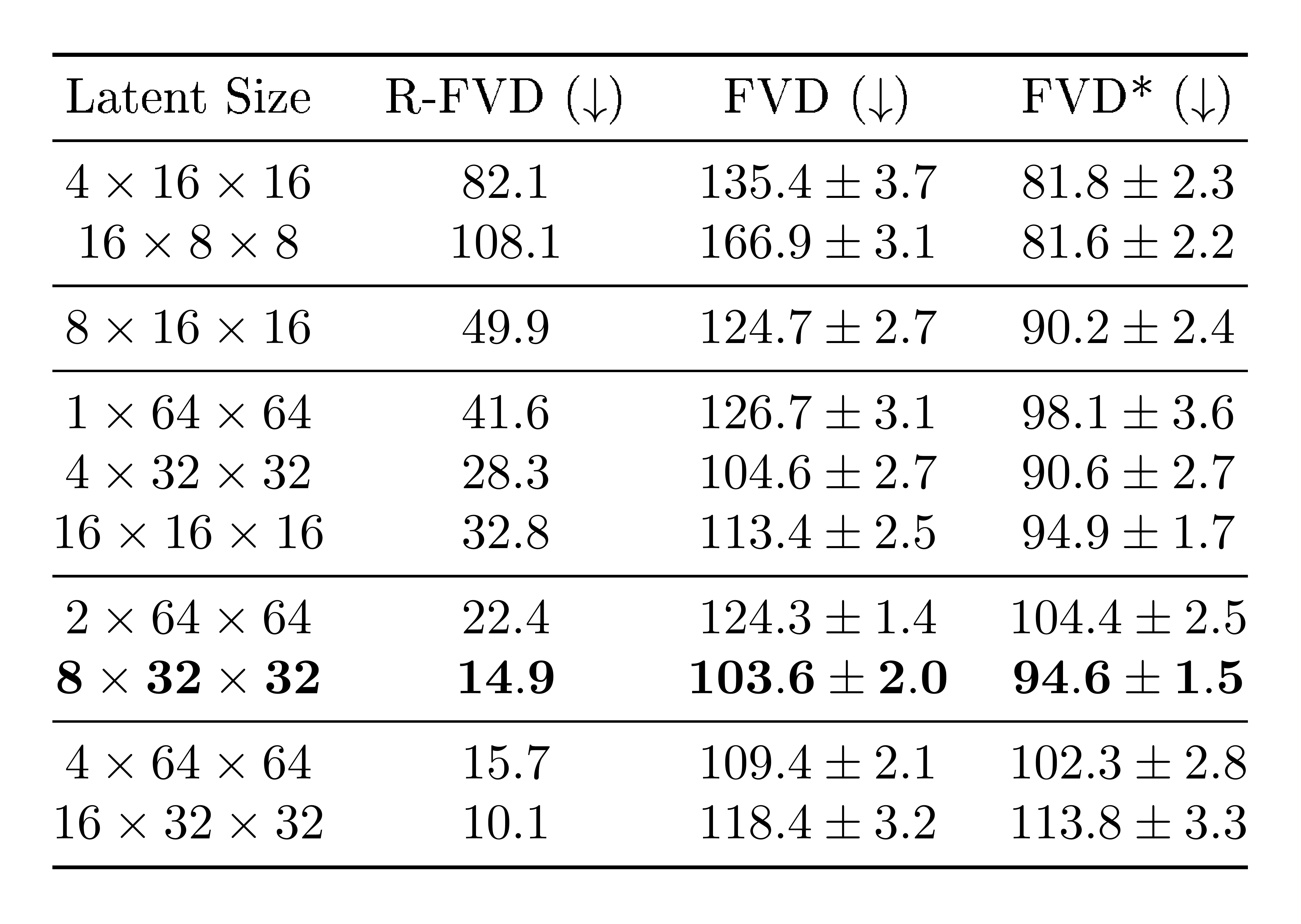 In addition to looking at the total number of latents, we also investigate the appropriate downsampling for each latent resolution. Each partition in Table 5 shows latent sizes with the same number of total latents, each with different spatio-temporal downsampling allocations. Unsurprisingly, we find that a balance of downsampling ratio ($2\times 2 \times 2$, corresponding to latent size $8\times 32 \times 32$) between space and time is the best, as opposed to downsampling over only space or only time.