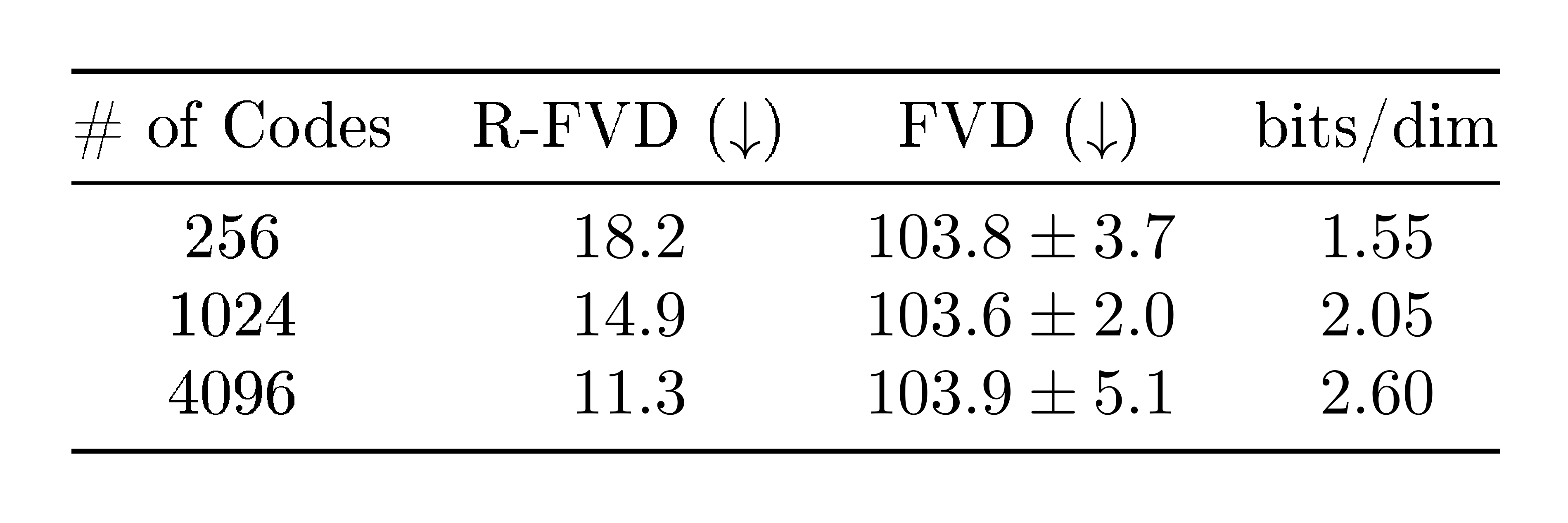 In Table 6, we show experimental results for running VideoGPT with different number of codes in the codebooks. For all three runs, the VQ-VAE latent code vector has size $8 \times 32 \times 32$. In the case of BAIR, we find that reconstruction quality improves with increasing the number of codes due to better expressivity in the discrete bottleneck. However, they ultimately do not affect sample quality. This may be due to the fact that in the case of BAIR, using 256 codes surpasses a base threshold for generation quality.