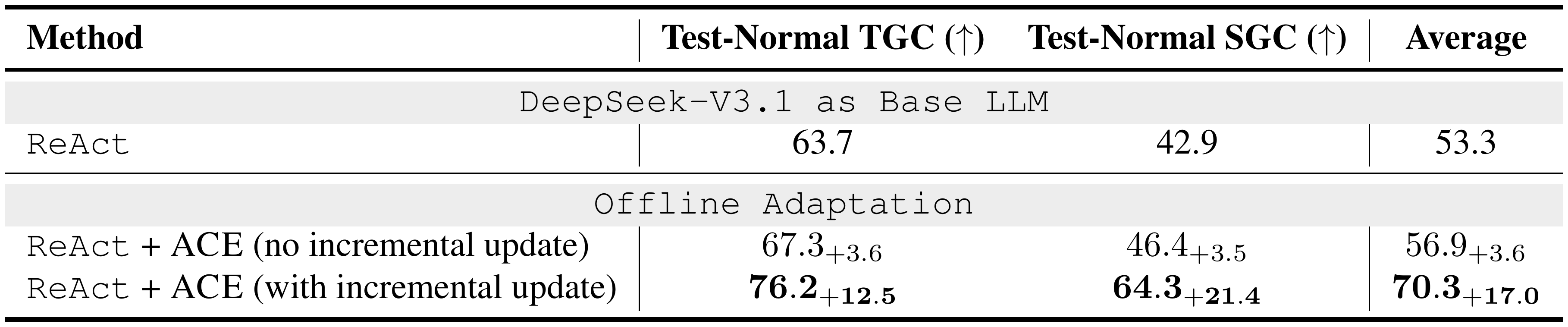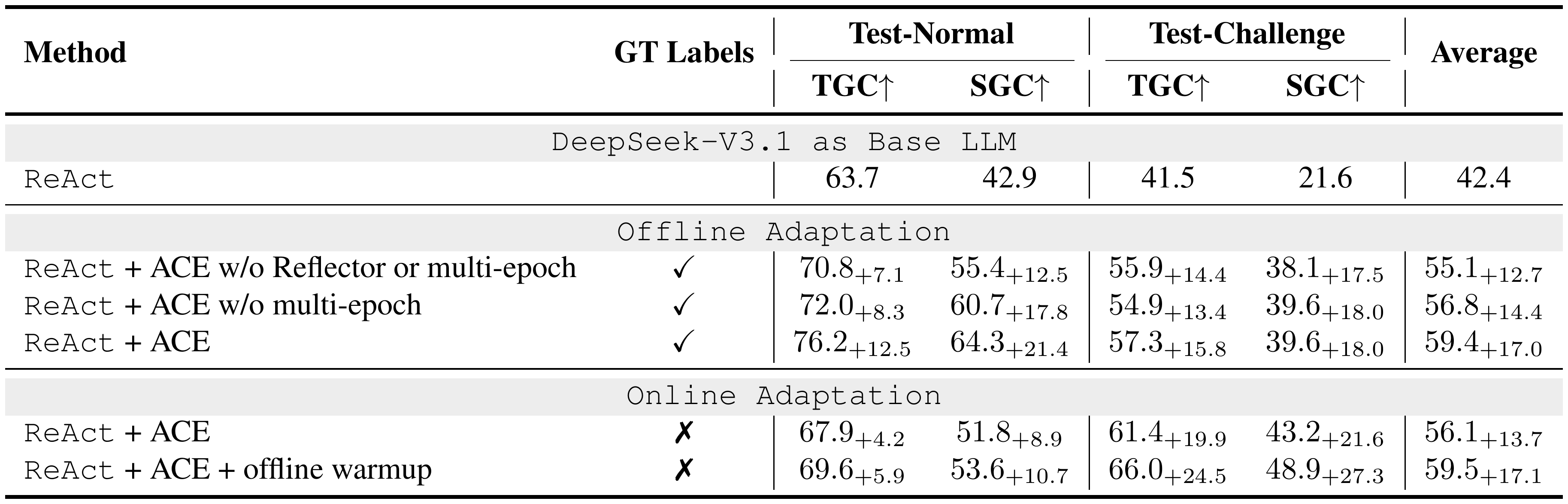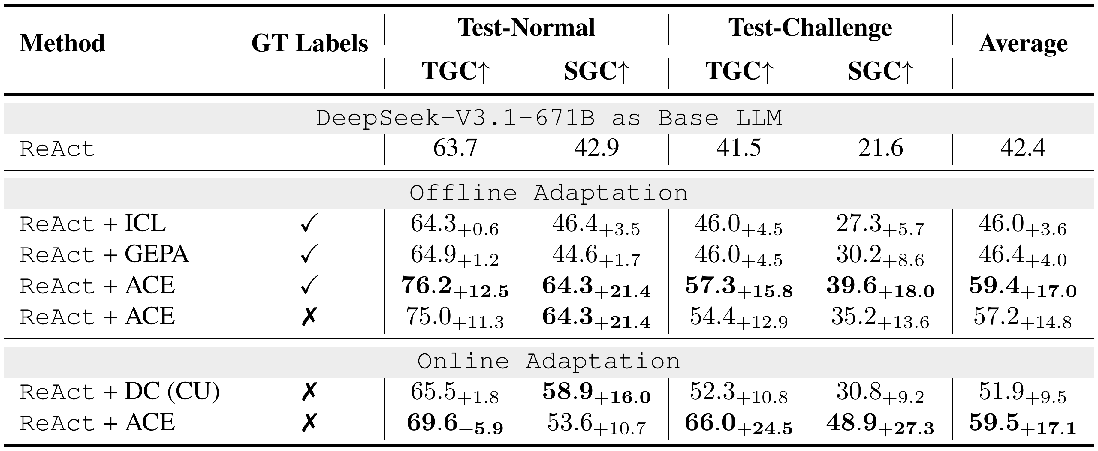 Notably, on the latest AppWorld leaderboard (as of September 20, 2025; Figure 5), ReAct + ACE (59.4% average) matches the top-1-ranked IBM CUGA (60.3%)[^1], a production-level GPT-4.1–based agent ([34]), despite using the much smaller open-source model DeepSeek-V3.1. With online adaptation, ReAct + ACE even surpasses IBM CUGA by 8.4% in TGC and 0.7% in SGC on test-challenge, underscoring the effectiveness of $\textsc{ACE}$ in building comprehensive and self-evolving contexts for agents.