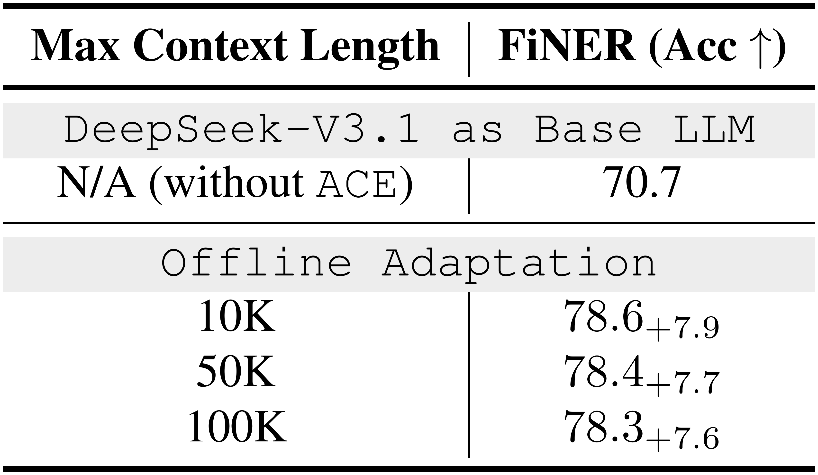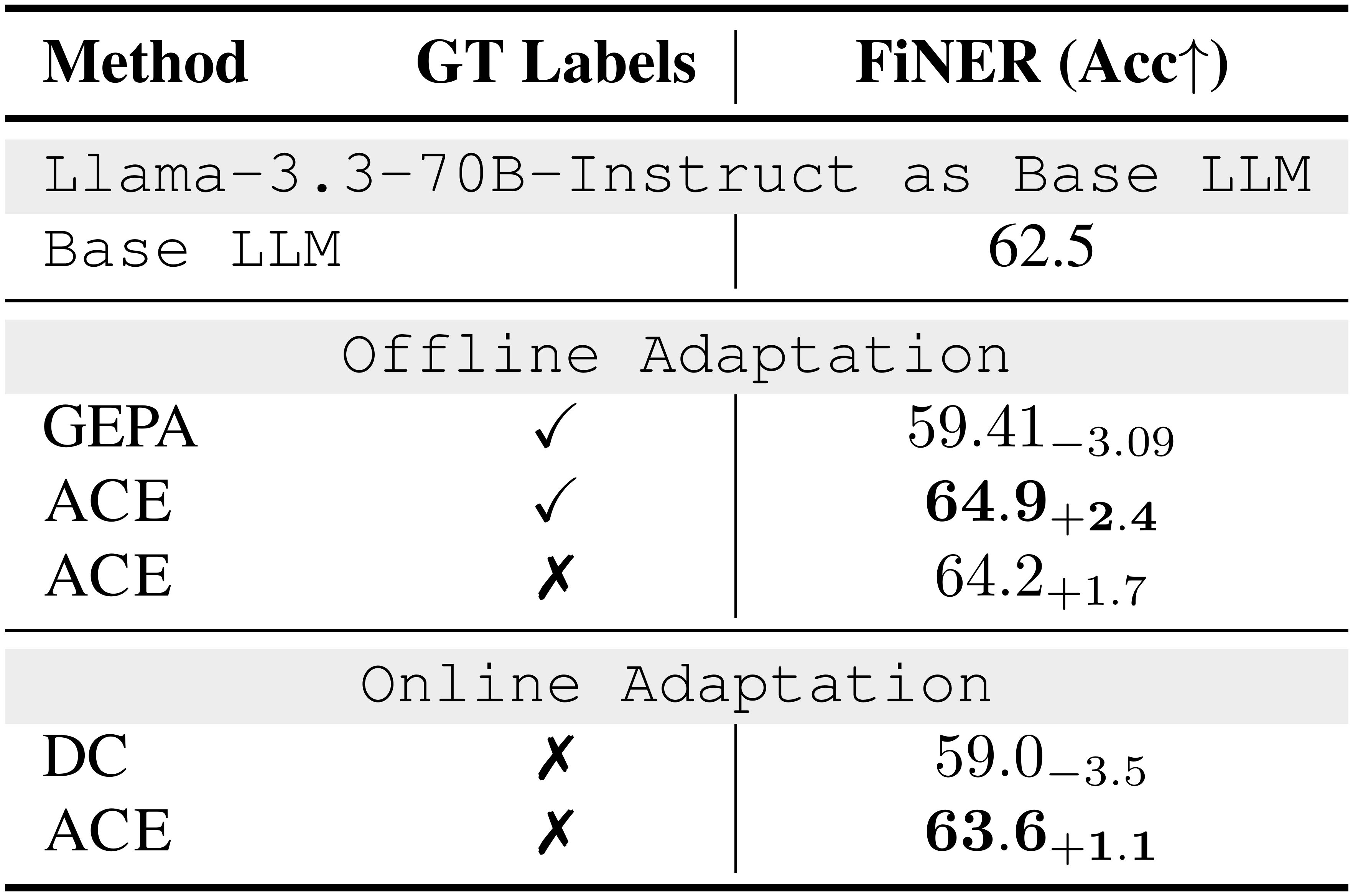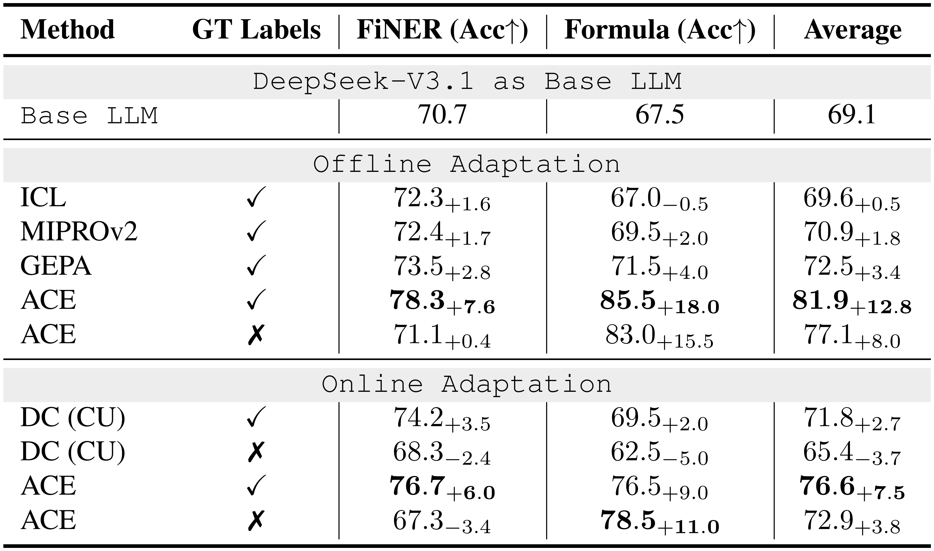Moreover, we also observe that when ground-truth supervision or reliable execution signals are absent, both ACE and DC may degrade in performance. In such cases, the constructed context can be polluted by spurious or misleading signals, highlighting a potential limitation of inference-time adaptation without reliable feedback. This suggests that while ACE is robust under rich feedback (*e.g., * code execution results or formula correctness in agent tasks), its effectiveness depends on the availability of signals that allow the Reflector and Curator to make sound judgments. We return to this limitation in § 5.