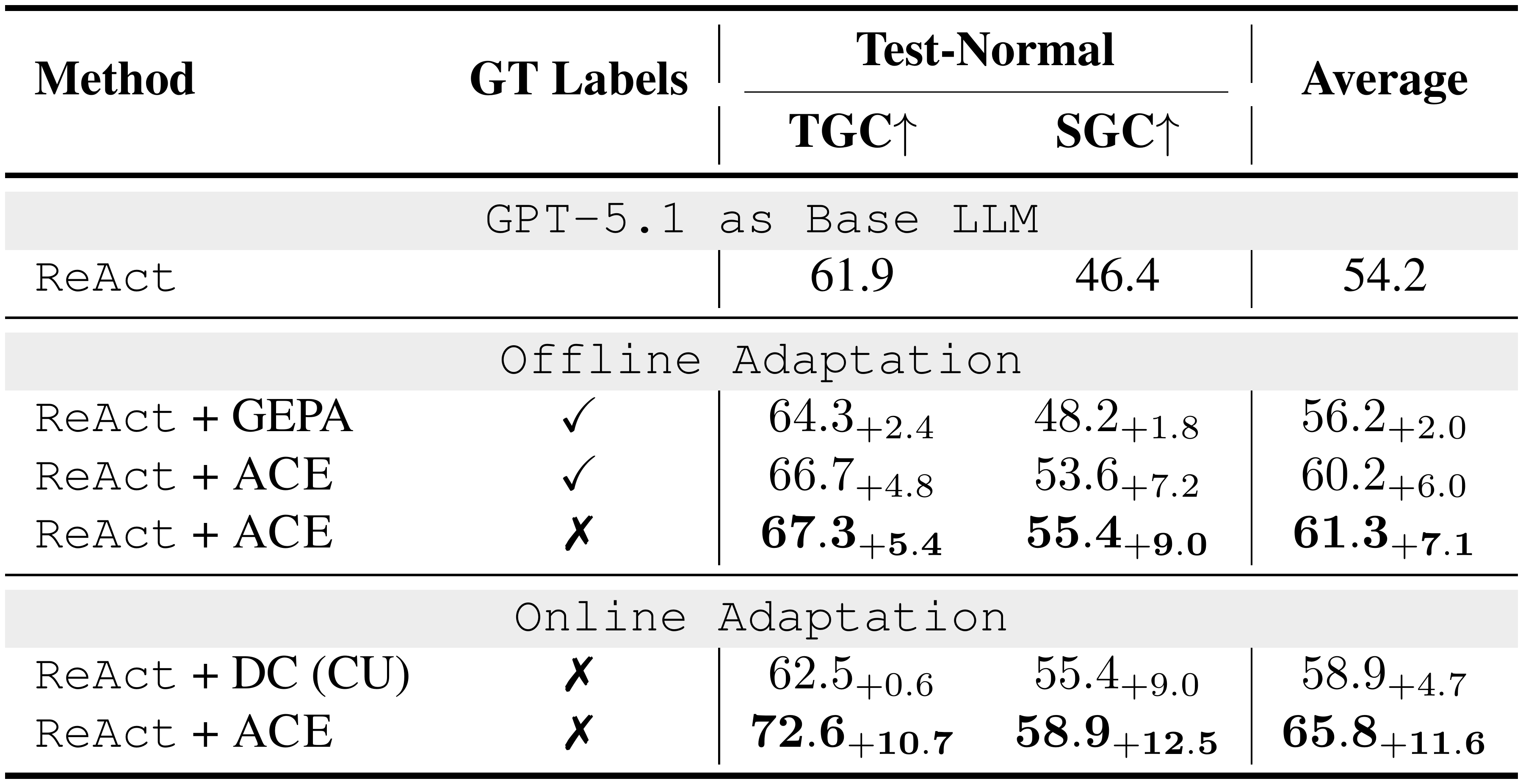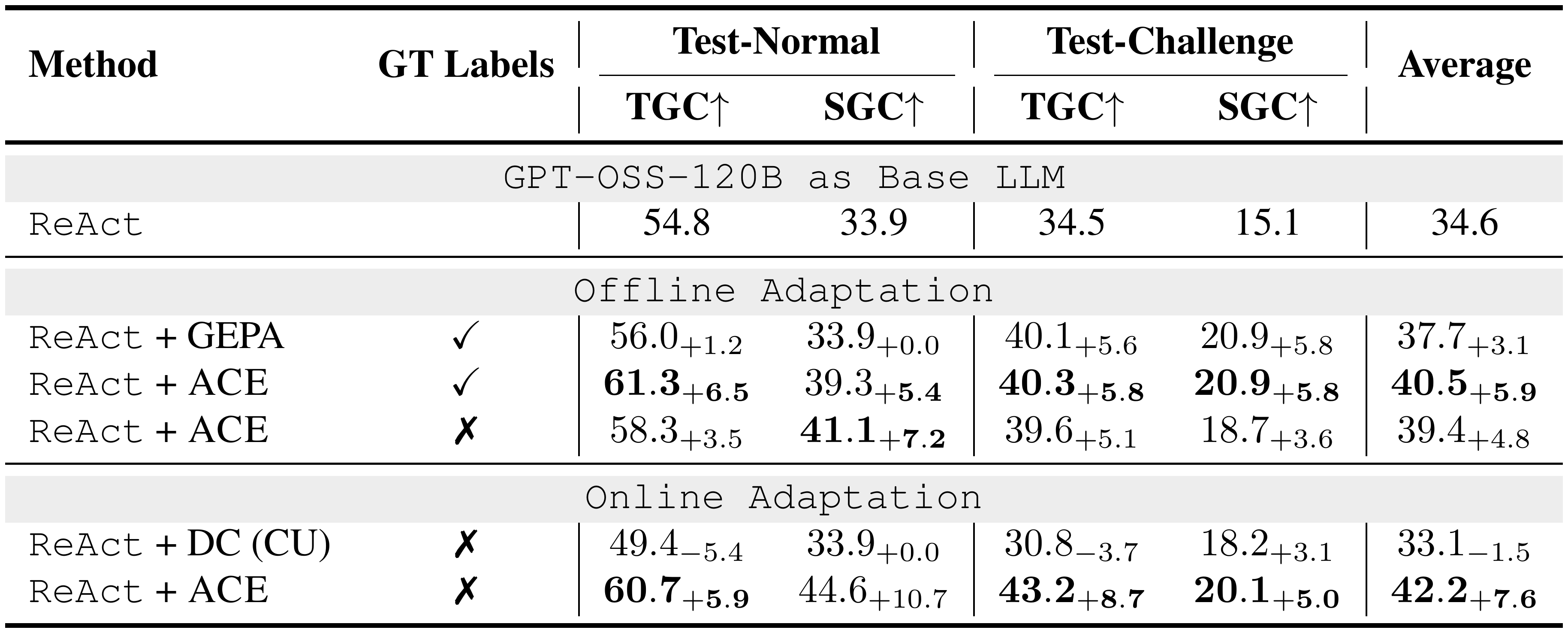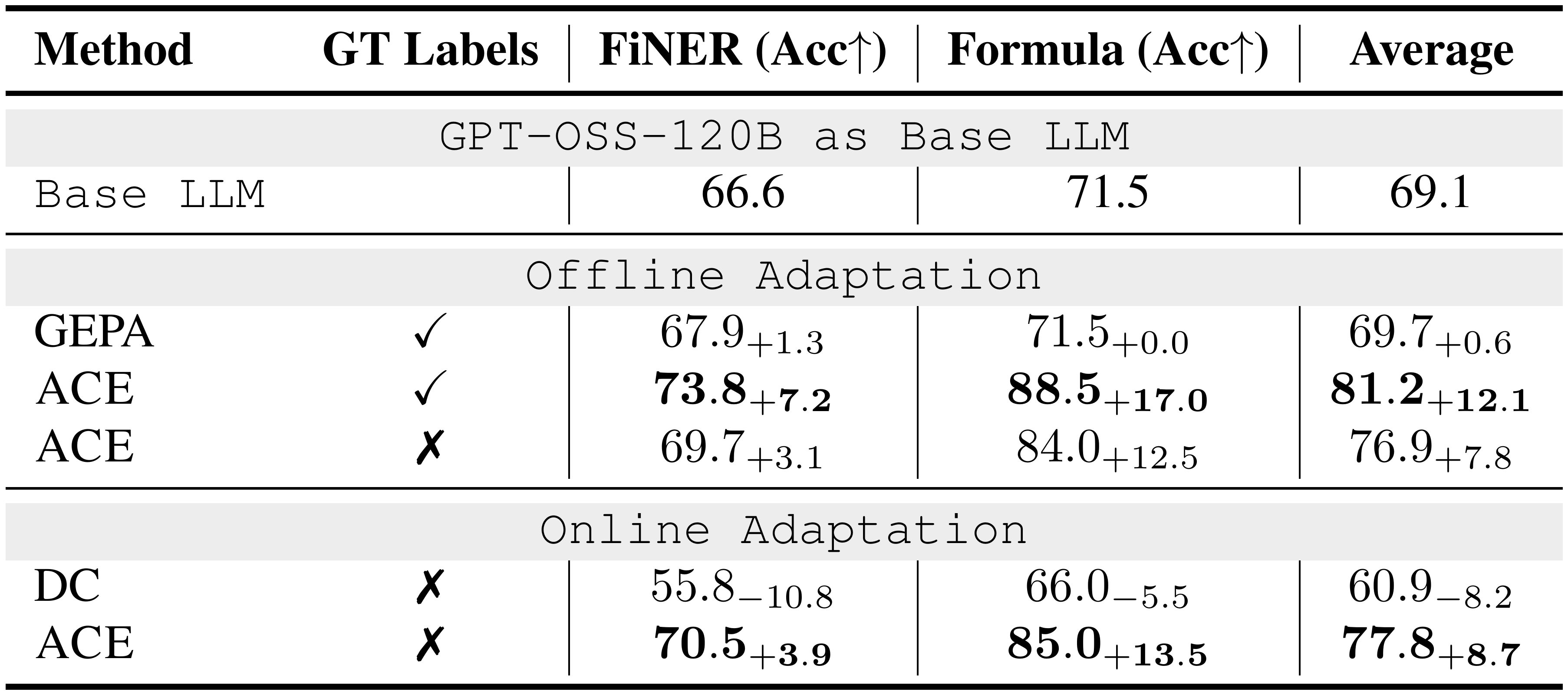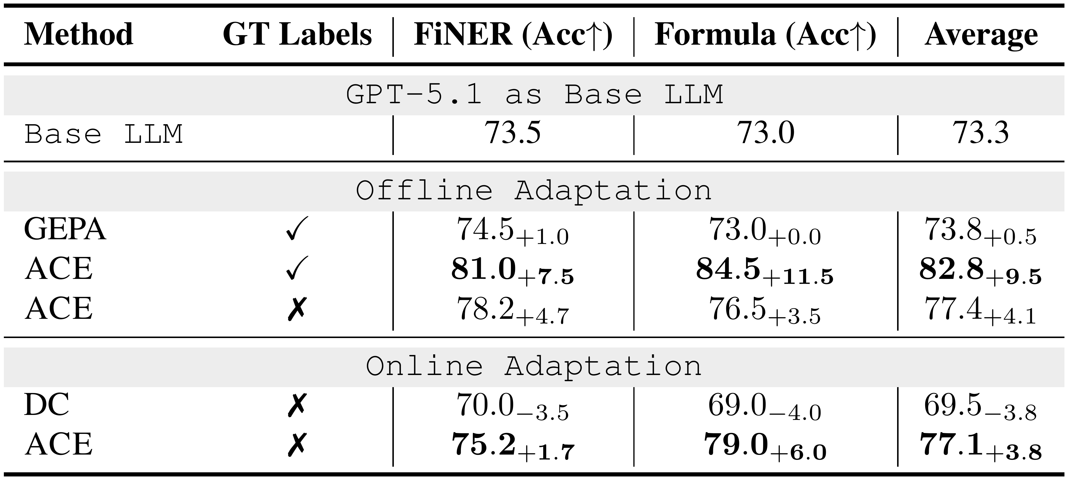 Across all four LLM families we tested (DeepSeek-V3.1, GPT-OSS-120B, GPT-5.1, and Llama-3.3-70B-Instruct), $\textsc{ACE}$ consistently improves performance over both the base LLM/agent, GEPA, and other baselines, often by 5 to 12 points depending on the task and supervision setting. The relative gains of $\textsc{ACE}$ remain stable even when switching to models that differ significantly in size, cost, and training recipe, and $\textsc{ACE}$ delivers benefits with or without ground-truth labels, validating the robustness of its context adaptation mechanism. The online variant reliably achieves the strongest performance across all models.