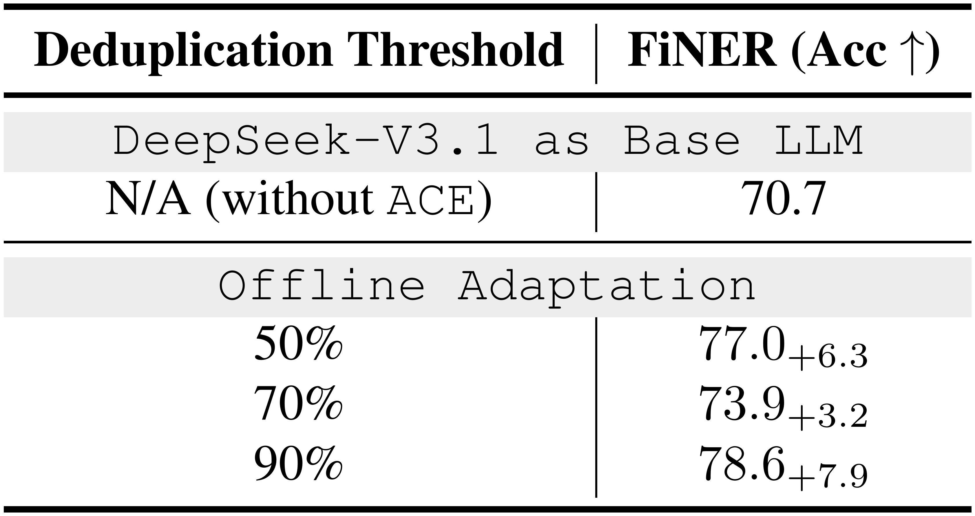 This threshold determines when $\textsc{ACE}$ merges and prunes older or low-utility entries to prevent unbounded growth. It balances (1) retaining enough accumulated context to improve learning from experience and (2) keeping the context compact to reduce cost and limit noise. On FiNER, performance is stable from 10K to 100K tokens, indicating $\textsc{ACE}$ does not require finely tuned length thresholds; pruning mainly removes stale or harmful fragments while preserving core reusable strategies.
