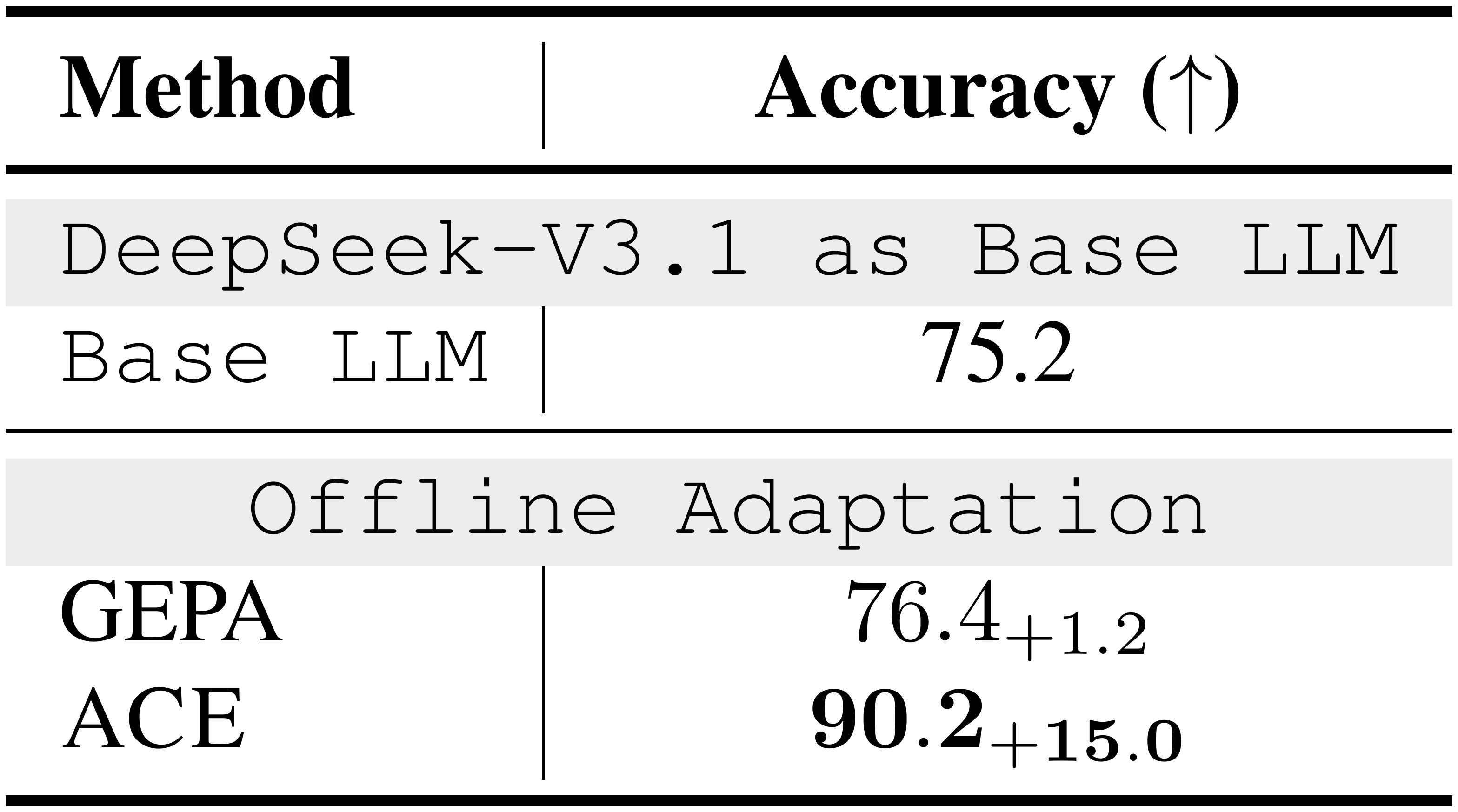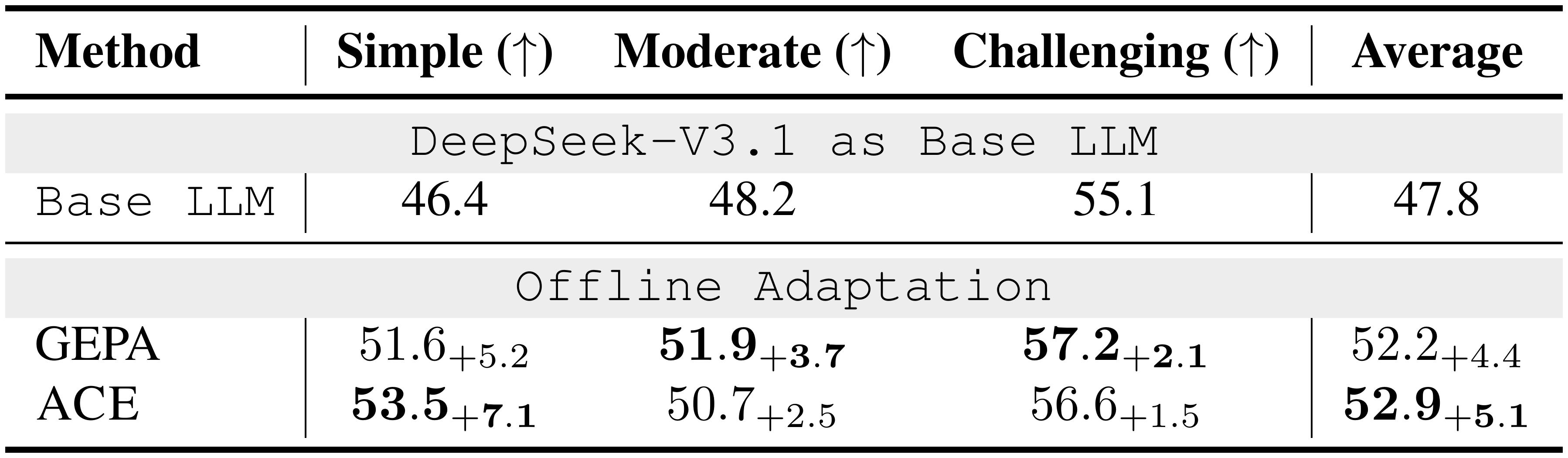 ACE optimizes LLM contexts for both offline and online adaptation through an agentic context engineering framework. To ensure fairness, we use the same LLM for the Generator, Reflector, and Curator (non-thinking mode of DeepSeek-V3.1 ([47])), preventing knowledge transfer from a stronger Reflector or Curator to a weaker Generator. This isolates the benefit of context construction itself. We additionally evaluate ACE with other backbone LLMs in the appendix, where we observe consistent gains. We adopt a batch size of 1 (constructing a delta context from each sample). We set the maximum number of Reflector refinement rounds and the maximum number of epoch in offline adaptation to 5.