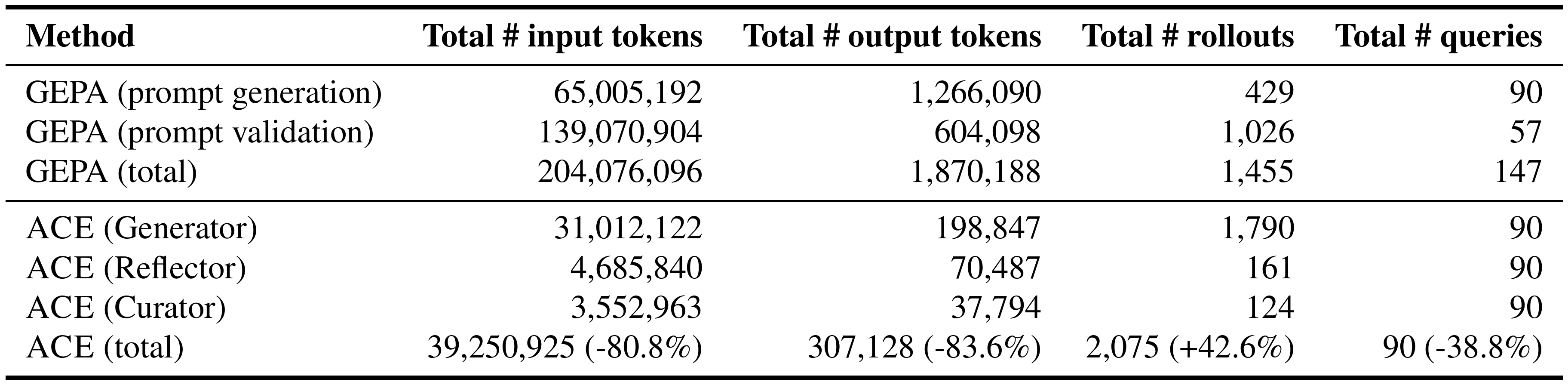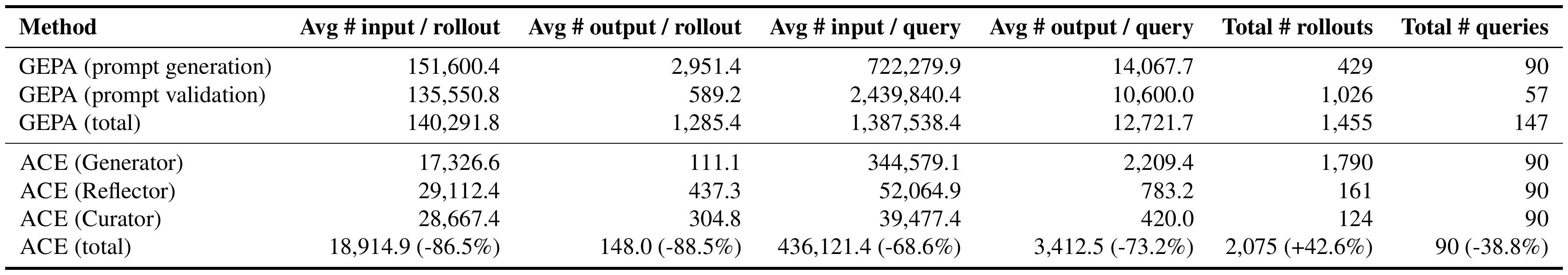 We conduct a fine-grained cost analysis of $\textsc{ACE}$ and GEPA (as a representative baseline). On AppWorld, $\textsc{ACE}$ is substantially cheaper during offline adaptation, reducing input/output token usage by 80.8%/83.6% vs. GEPA: $\textsc{ACE}$ avoids GEPA's prompt-validation loop and replaces repeated full rewrites with localized delta updates. At evaluation time, while $\textsc{ACE}$ may use more raw input tokens due to a richer playbook, this does not necessarily translate to higher billed serving cost because a large fraction of the context is reused by KV caching; we quantify this effect in the next paragraph. Full results, including a component-wise token breakdown for both methods, are in Appendix § A.3.