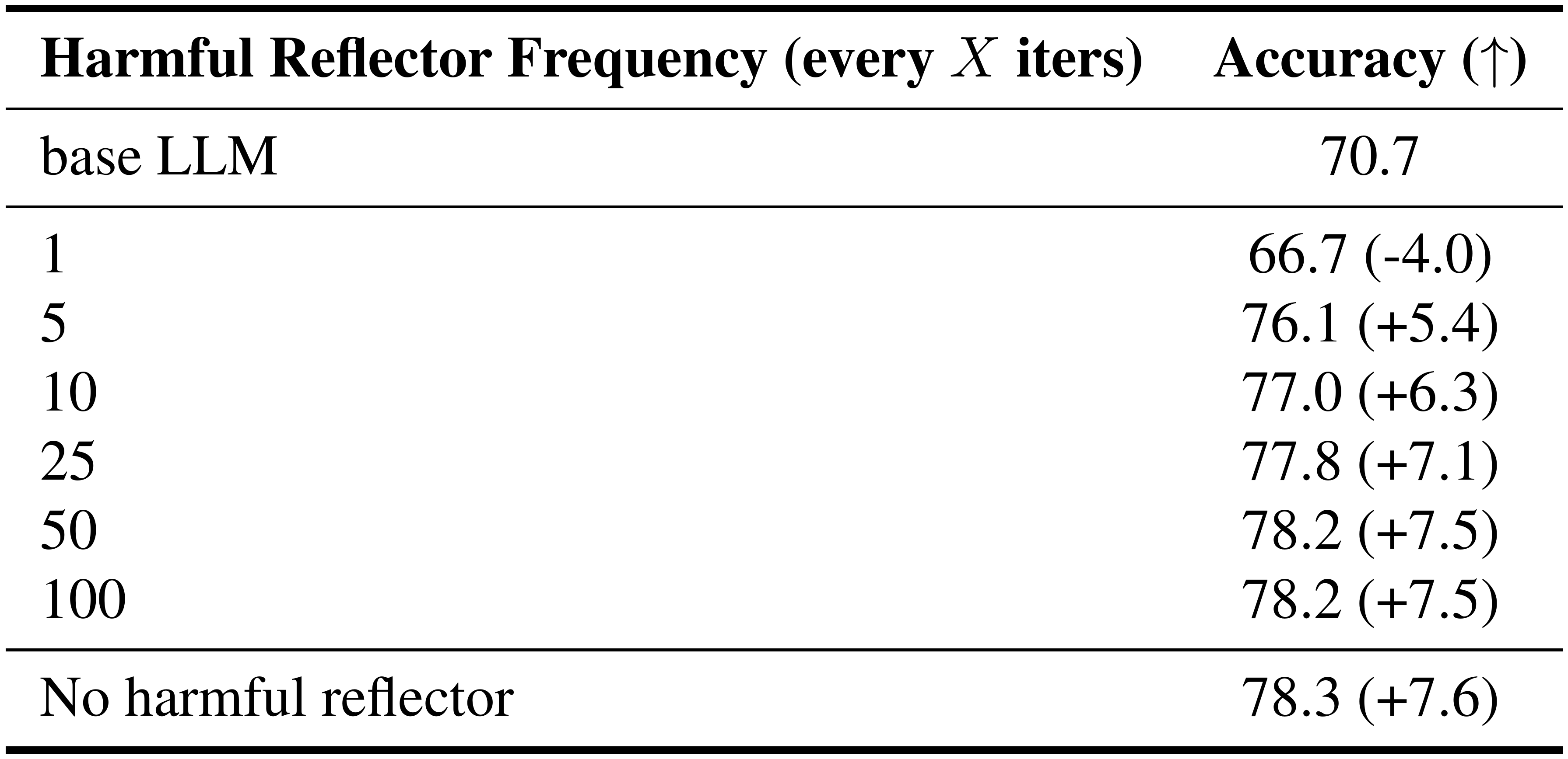 We further stress-test $\textsc{ACE}$ with actively harmful reflector outputs by injecting adversarial or conflicting bullets: we invoke a "harmful" reflector that is explicitly instructed to inject harmful reflection once every $X$ adaptation steps, where larger $X$ means less frequent corruption (Table 17). $\textsc{ACE}$ is robust to moderate noise levels: performance degrades gradually as corruption becomes more frequent and stays above the base LLM except in the extreme case of injecting harmful updates every iteration. This suggests that $\textsc{ACE}$ 's update mechanism tolerates substantial noise in the reflection stream, with failures emerging only under intentionally adversarial conditions.