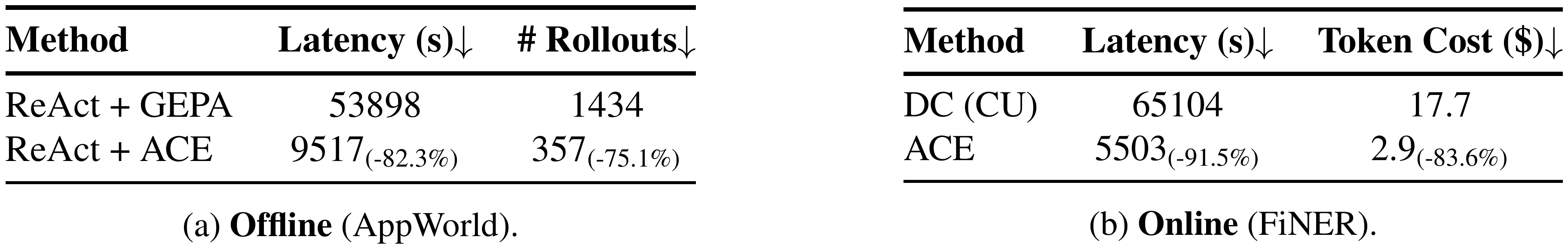 As examples, on the offline adaptation of AppWorld, ACE achieves 82.3% reduction in adaptation latency and 75.1% reduction in the number of rollouts as compared to GEPA (Table 4(a)). On the online adaptation of FiNER, ACE achieves 91.5% reduction in adaptation latency and 83.6% reduction in token dollar cost for token ingestion/generation as compared to DC (Table 4(b)).