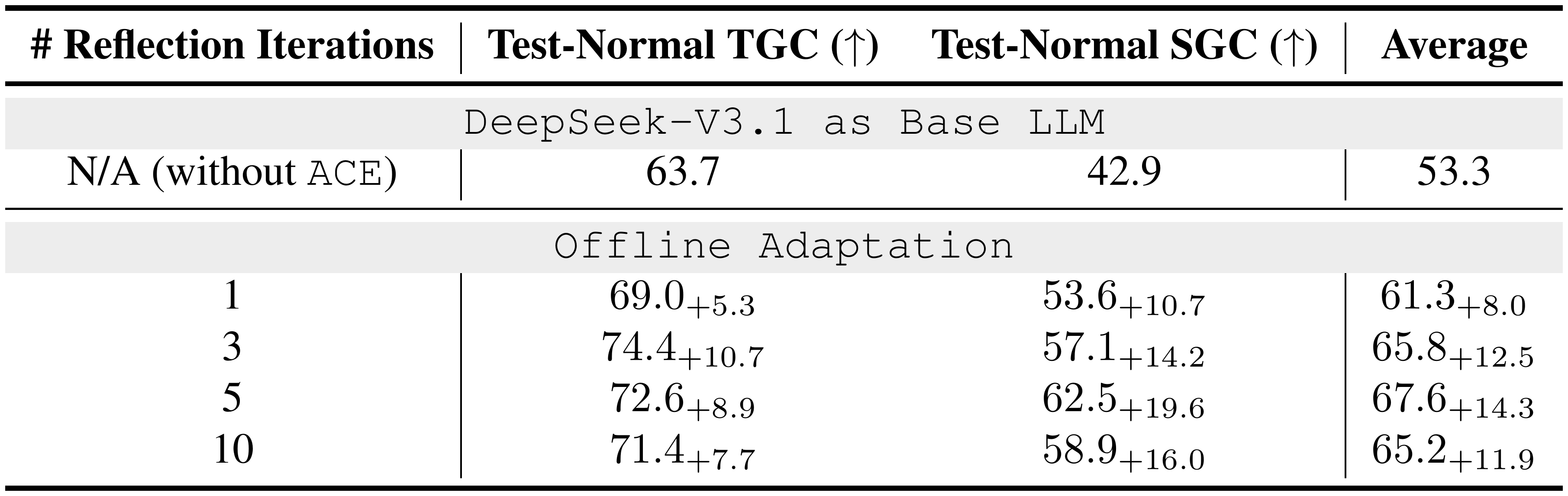 ::: {caption="Table 19: Effect of Reflection Iterations (AppWorld, DeepSeek-V3.1). We report test-normal results under offline context adaptation. Improvements are relative to running ReAct without $\textsc{ACE}$."}