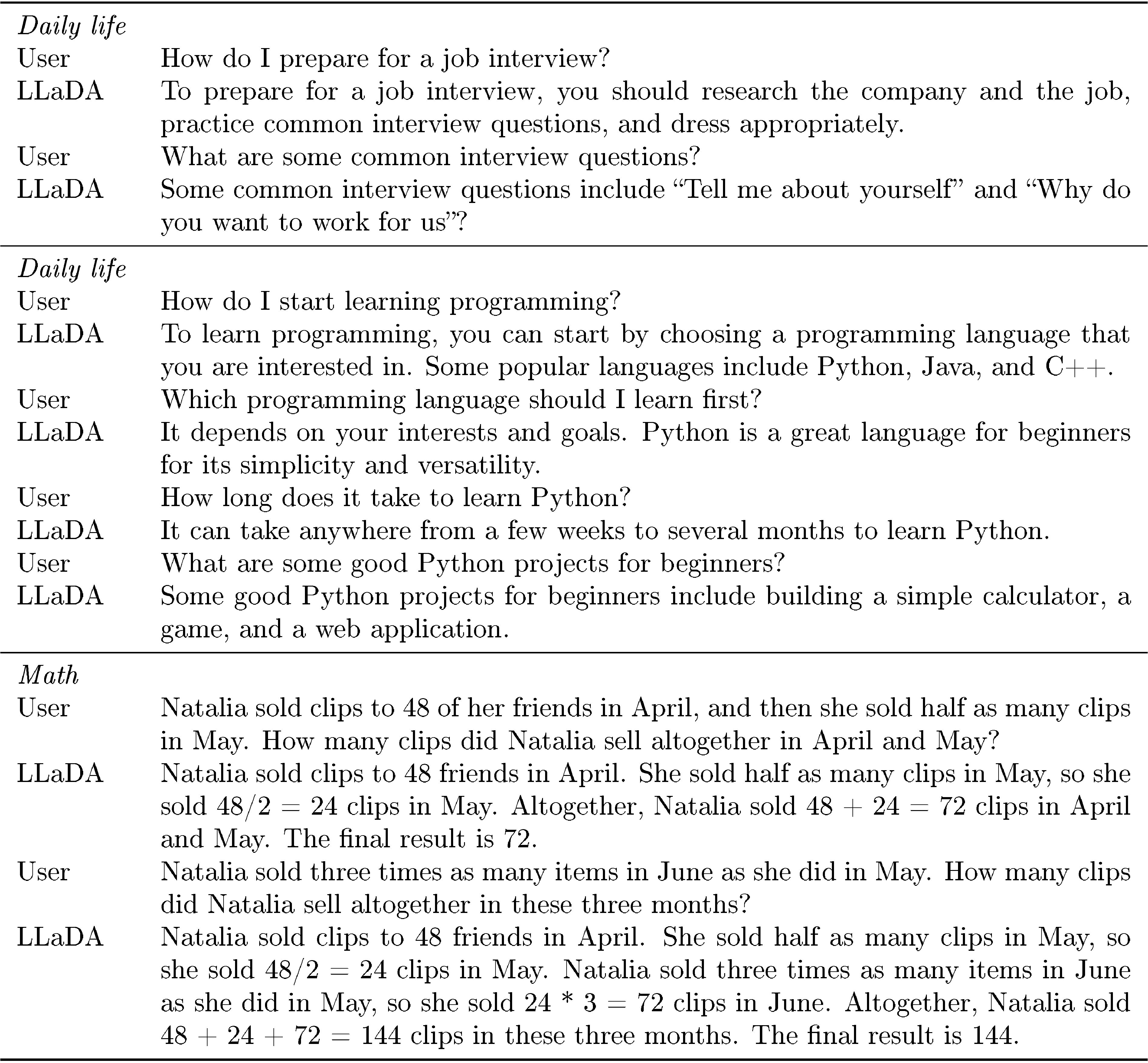 The LLaDA model is pre-trained on a dataset comprising 2.3 trillion (T) tokens, adhering to a data protocol that aligns closely with existing LLMs ([25, 26]), without the incorporation of any special techniques. The data are derived from online corpora, with low-quality content filtered through manually designed rules and LLM-based approaches. Beyond general text, the dataset encompasses high-quality code, math, and multilingual data. Please refer to Appendix B.1 for more details about datasets. The mixing of data sources and domains is guided by scaled-down ARMs. The pre-training process utilizes a fixed sequence length of 4096 tokens, incurring a total computational cost of 0.13 million H800 GPU hours, similar to ARMs of the same scale and dataset size.