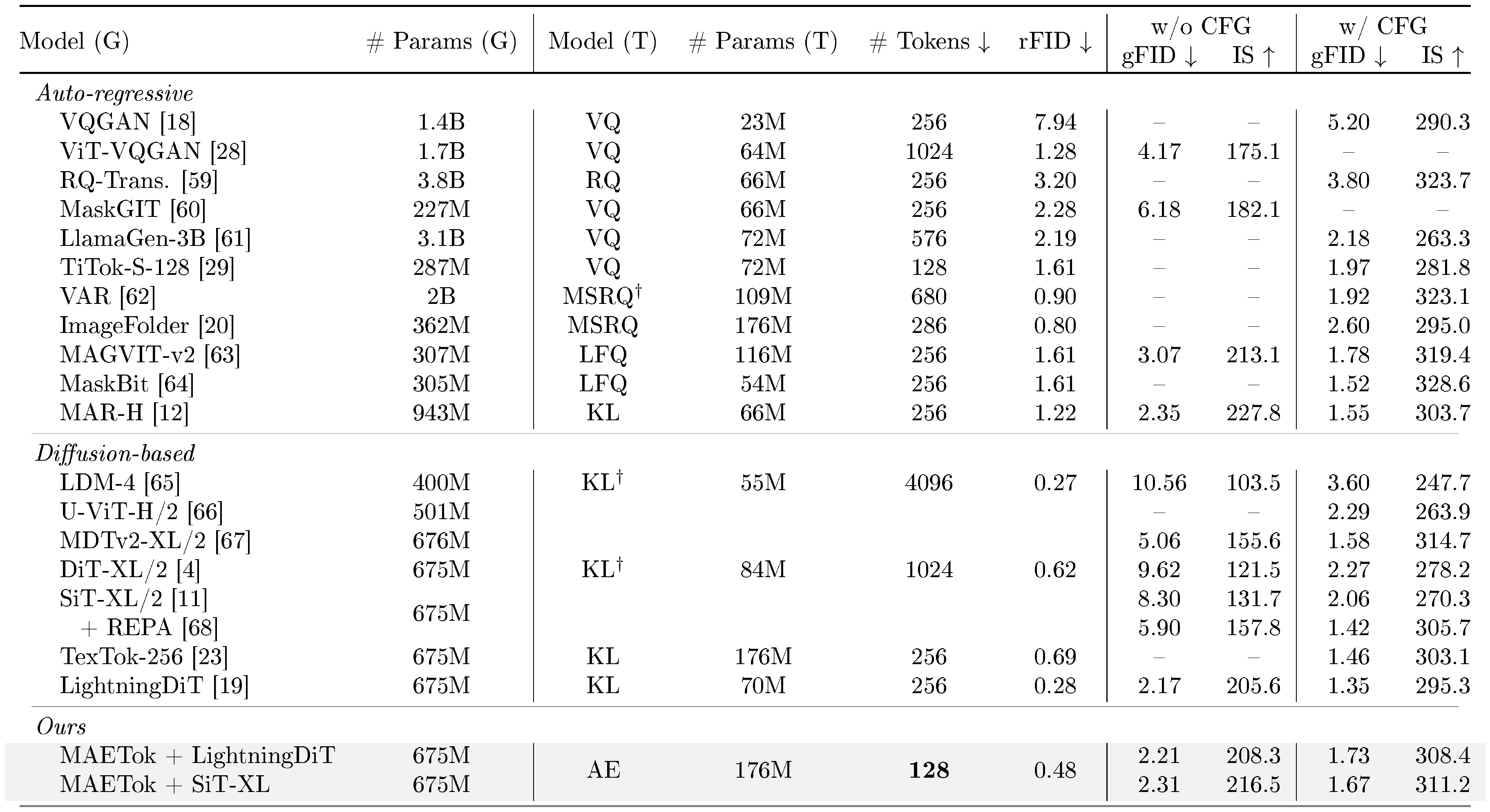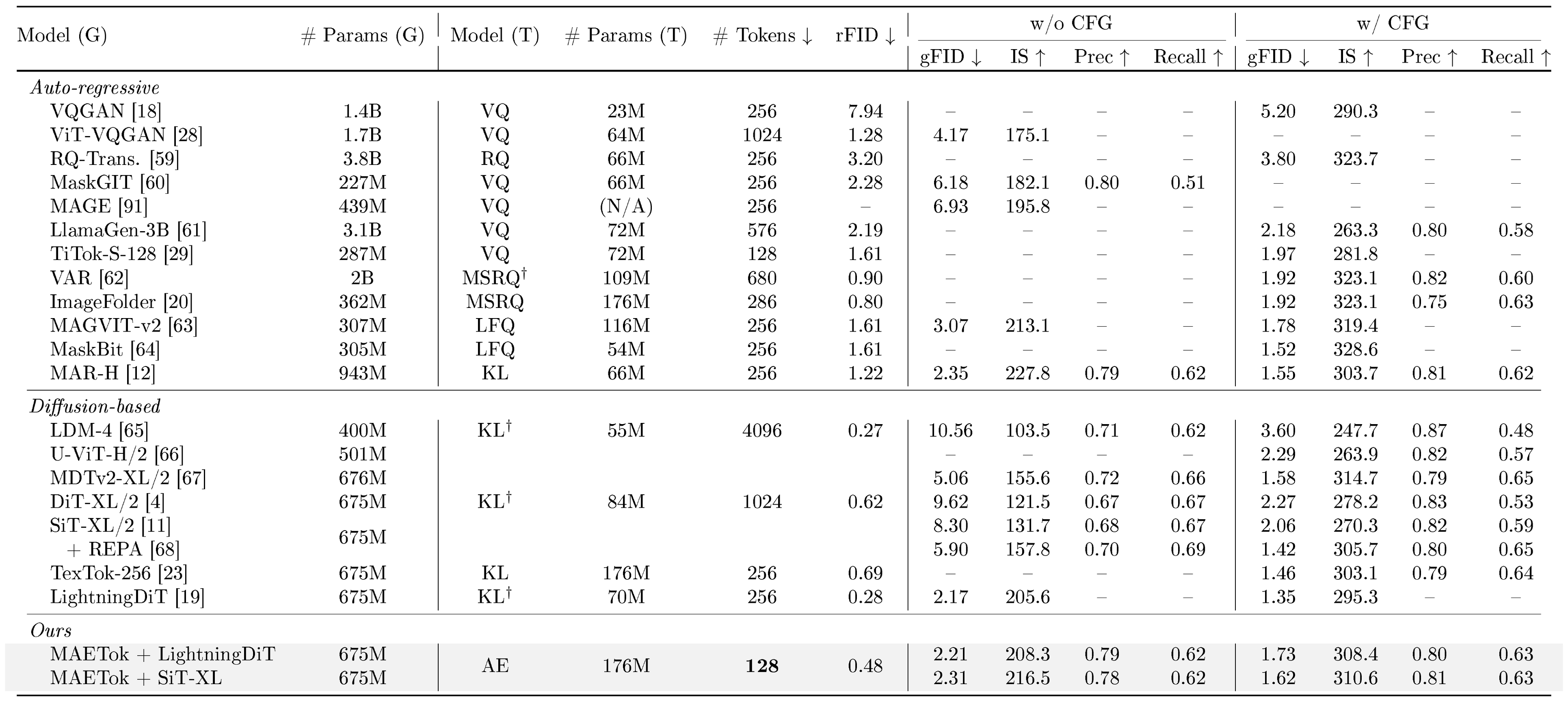 ::: {caption="Table 2: System-level comparison on ImageNet 256 $\times$ 256 conditional generation. SiT-XL and LightningDiT trained on MAETok achieves performance comparable to state-of-the-art using plain AE with only 128 tokens. "Model (G)": the generation model. "# Params (G)": the number of generator's parameters. "Model (T)": the tokenizer model. "# Params (T)": the number of tokenizer's parameters. "# Tokens": the number of latent tokens used during generation. $^\dagger$ indicates that the model has been trained on other data than ImageNet."}