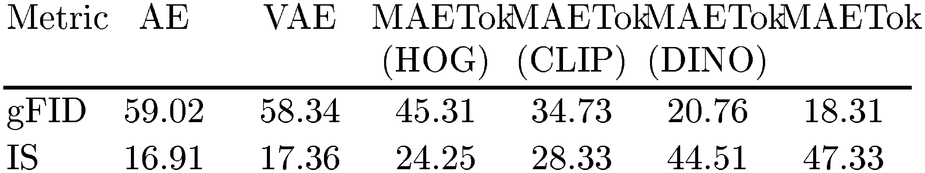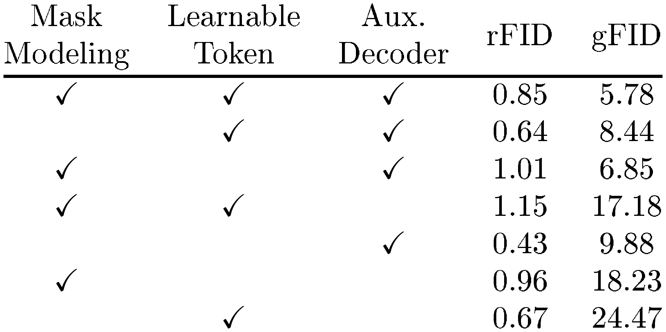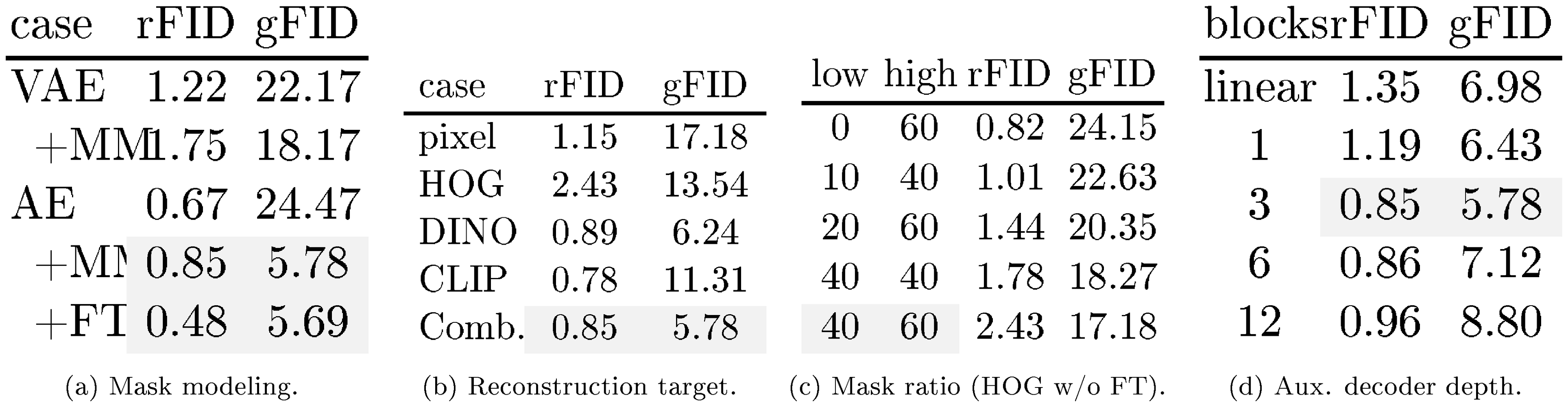 Reconstruction Target. In Table 1b, we study how different reconstruction targets affect latent space learning in mask modeling. We show that using the low-level reconstruction features, such as the raw pixel (with only a pixel decoder) and HOG features, can already learn a better latent space, resulting in a lower gFID. Adopting semantic teachers such as DINO-v2 and CLIP instead can significantly improve gFID. Combining different reconstruction targets can achieve a balance in reconstruction fidelity and generation quality.