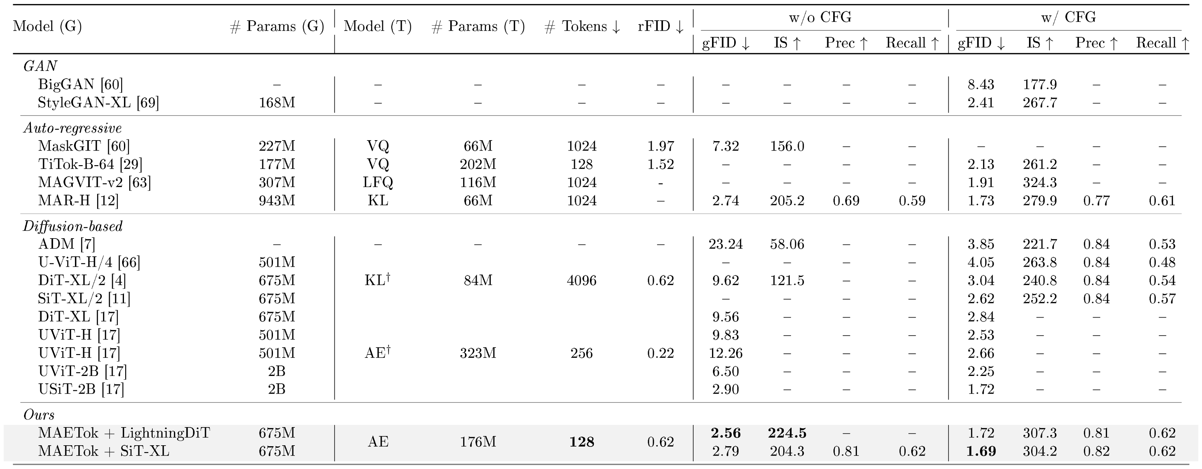 ::: {caption="Table 3: System-level comparison on ImageNet 512 $\times$ 512 conditional generation. SiT-XL and LightningDiT trained on MAETok achieve state-of-the-art performance using plain AE with only 128 tokens, outperforming USiT of 2B parameters using only 675M parameters."}