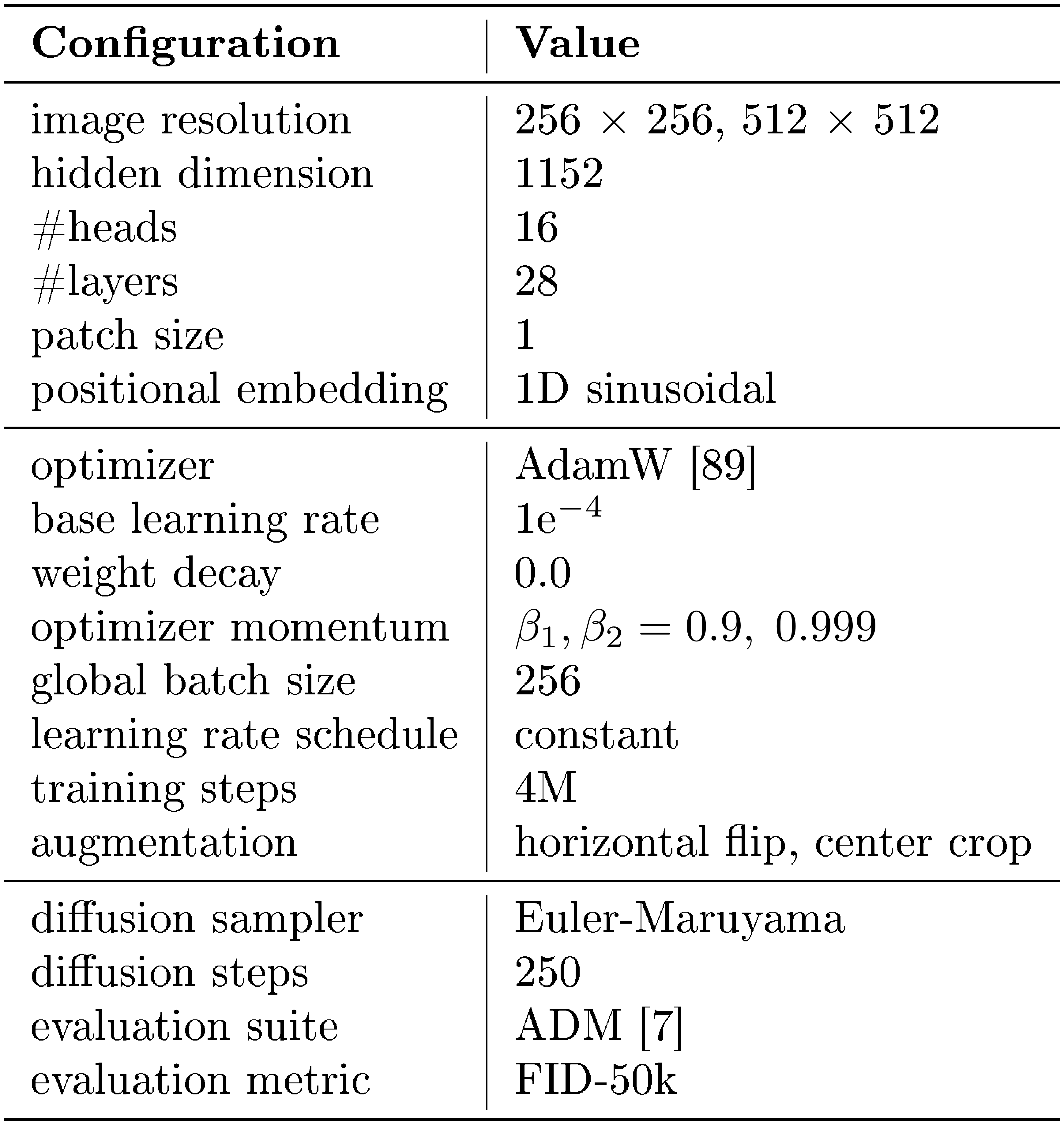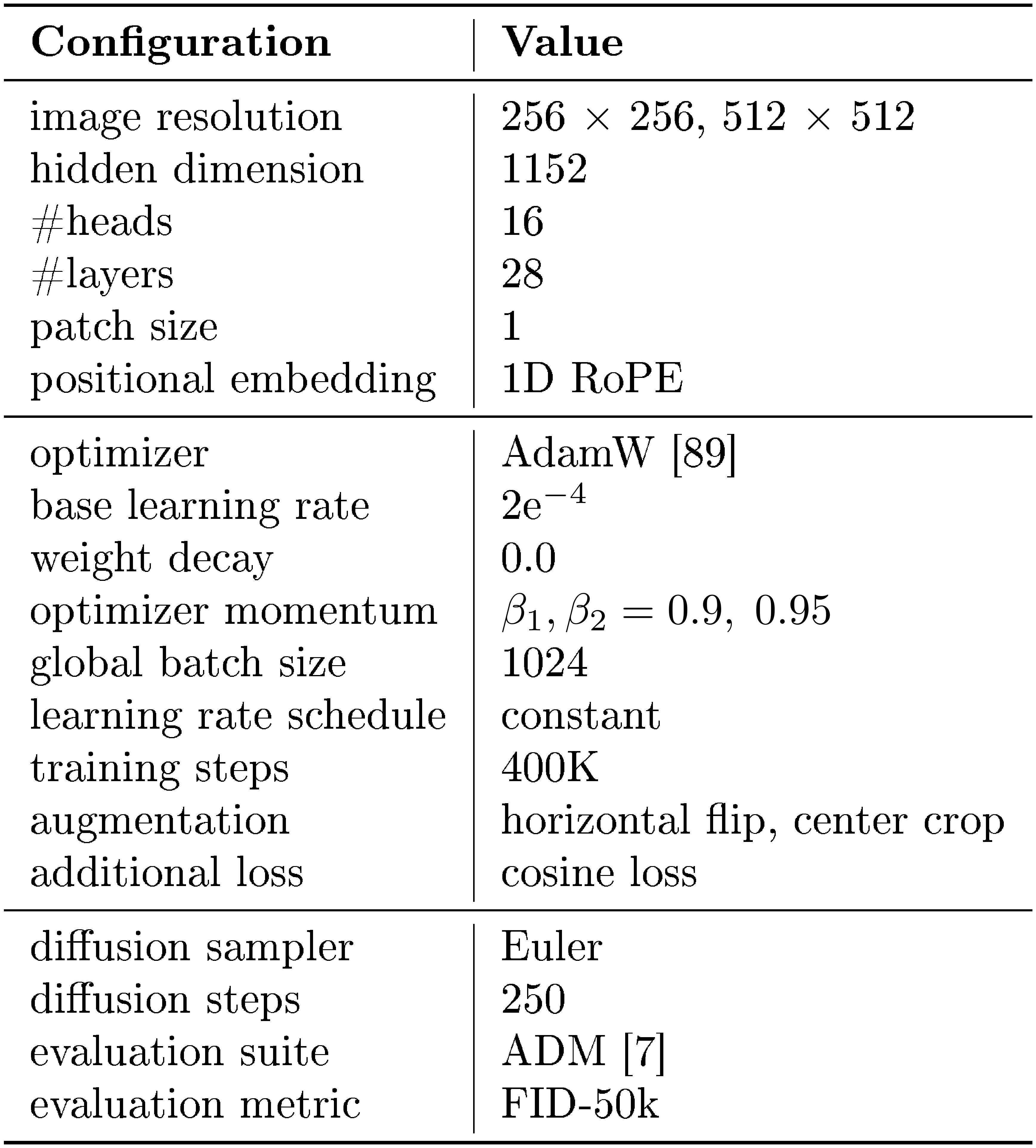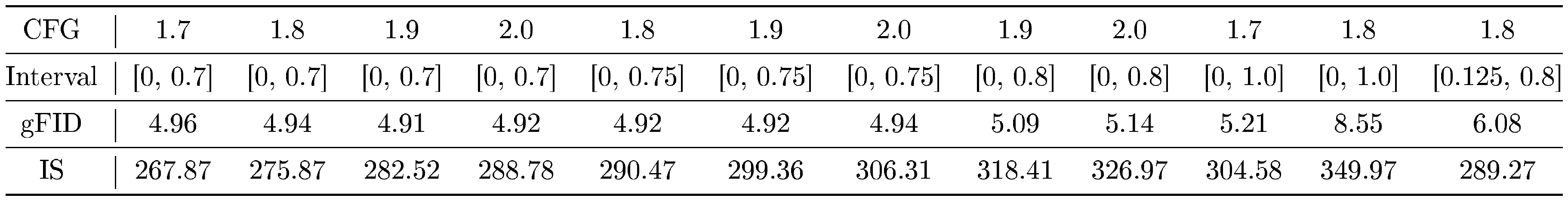 We use a guidance scale of 1.9 and an interval of [0, 0.75] for 256 $\times$ 256 SiT-XL and a guidance scale of 1.8 and an interval of [0, 0.75] for 256 $\times$ 256 LightningDiT to report the main results. For 512 $\times$ models, we use a guidance scale of 1.5 and an interval of [0, 0.7] for SiT-XL and a guidance scale of 1.6 with an interval of [0, 0.65] for LightningDiT's main results. Note that our models may present even better results with more fine-grained CFG tuning.