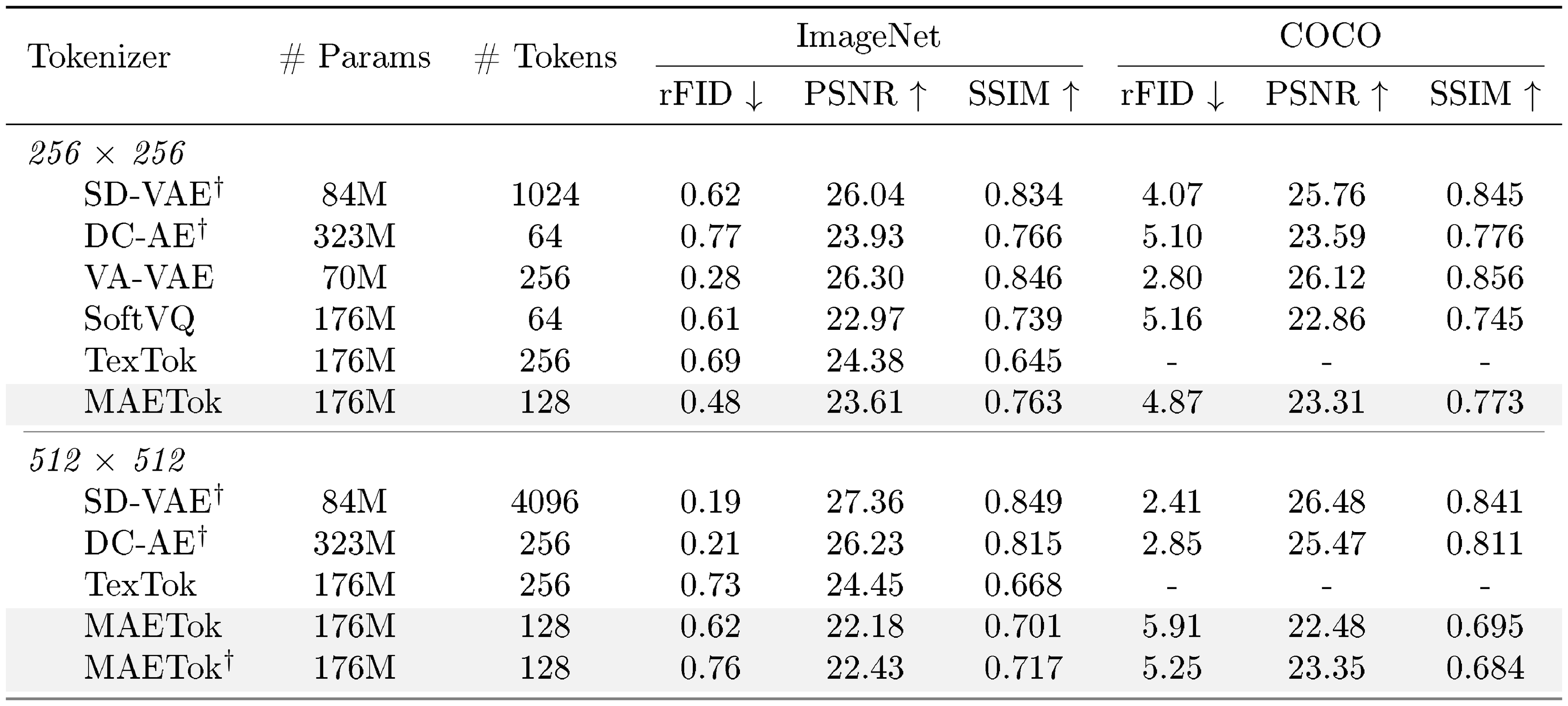 Reconstruction. MAETok also offers strong reconstruction capabilities on ImageNet and MS-COCO, as shown in Table 4. Compared to previous continuous tokenizers, including SD-VAE [3], DC-AE [17], VA-VAE [19], SoftVQ-VAE [21], and TexTok [23], MAETok achieves a favorable trade-off between the quality of the reconstruction and the size of the latent space. On 256 $\times$ 256 ImageNet, using 128 tokens, MAETok attains an rFID of 0.48 and SSIM of 0.763, outperforming methods such as SoftVQ in terms of both fidelity and perceptual similarity, while using half of the tokens in TexTok [23]. On MS-COCO, where the tokenizer is not directly trained, MAETok still delivers robust reconstructions. At resolution of 512, MAETok maintains its advantage by balancing compression ratio and the reconstruction quality.