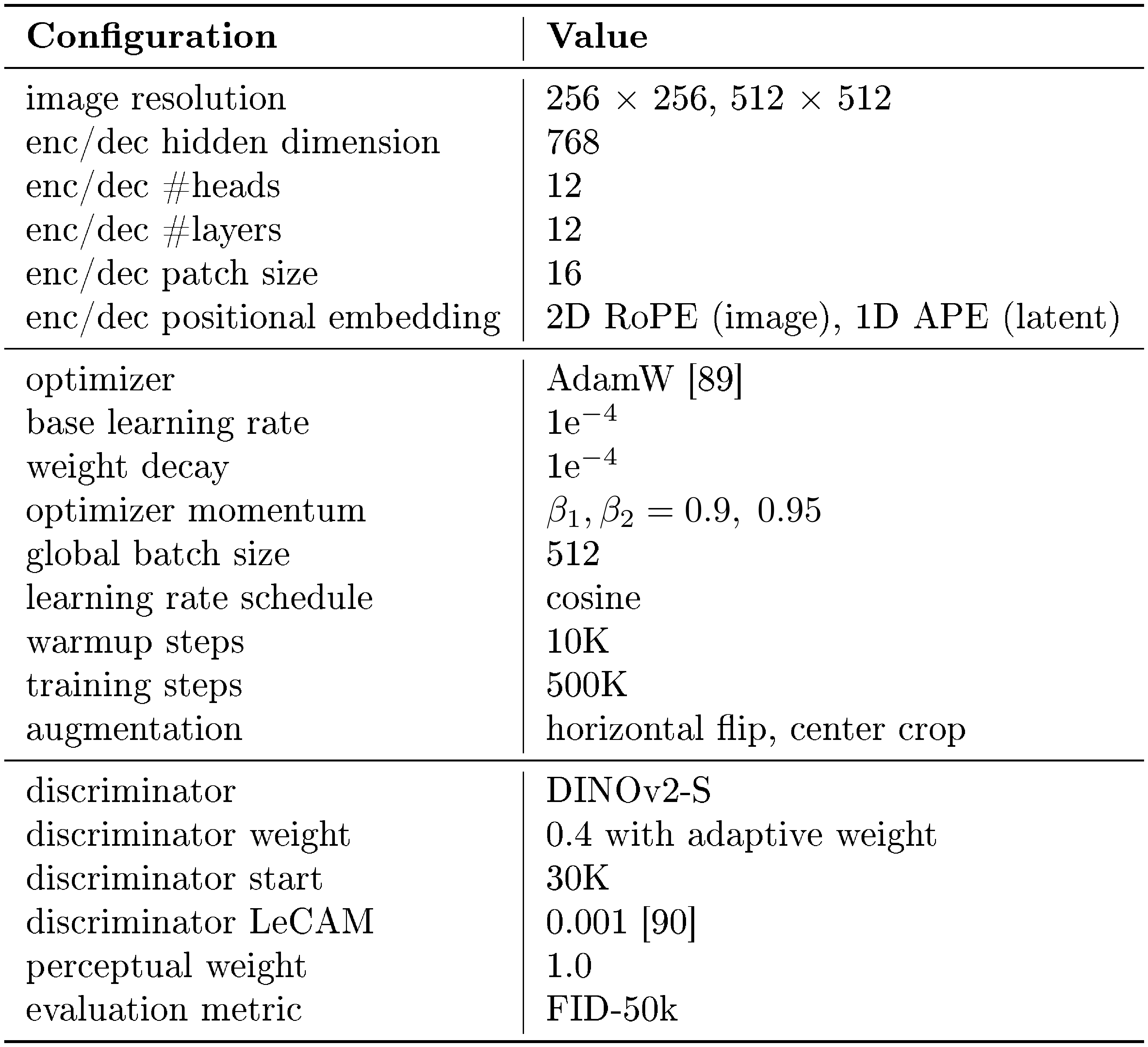 Position Encoding. To encode spatial information, we apply 2D Rotary Position Embedding (RoPE) to the image patch tokens $\mathbf{x}$ at the encoder and the image tokens $\mathbf{e}$ at the decoder. In contrast, the latent tokens $\mathbf{z}$ (and their encoded counterparts $\mathbf{h}$) use standard 1D absolute position embeddings, since they do not map to specific spatial locations. This design ensures that patch-based tokens retain the notion of 2D layout, while the learned latent tokens are treated as a set of abstract features within the transformer architecture.