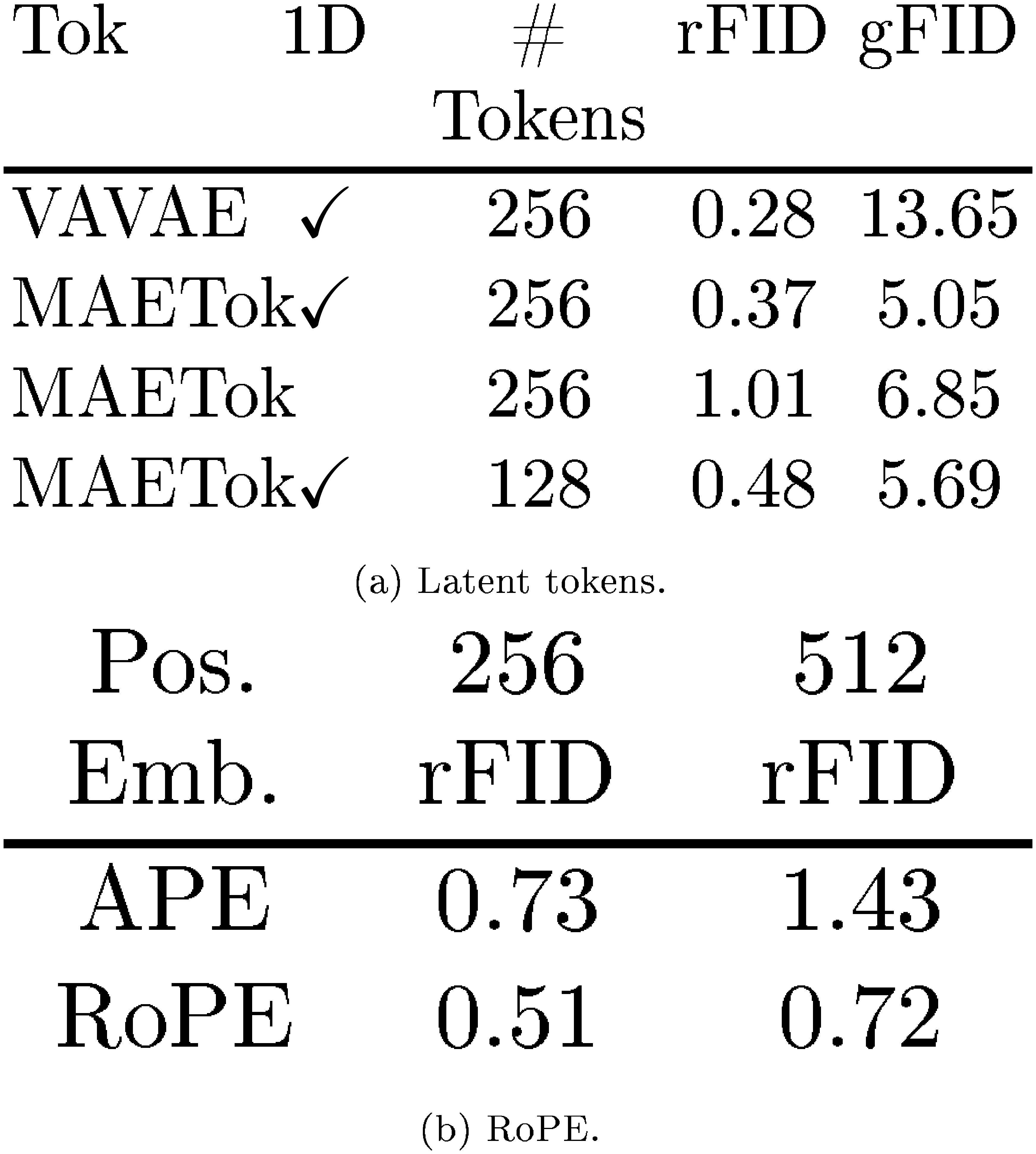 ::: {caption="Table 13: Ablations of latent tokens and 2D RoPE with MAETok on 256 $\times$ 256 ImageNet. We report rFID of tokenizer and gFID of SiT-L trained on latent space of the tokenizer without classifier-free guidance. We train tokenizer of 250K and SiT-L for 400K steps."}
