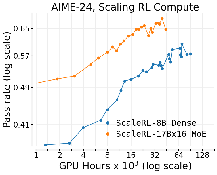 Executive Summary: Reinforcement learning (RL) plays a pivotal role in enhancing large language models (LLMs) for tasks like mathematical reasoning and agentic behavior, where models generate step-by-step thinking to solve complex problems. As RL compute budgets for LLMs have surged—reaching 100,000 GPU-hours or more in recent models like DeepSeek-R1 and OpenAI's o1 series—this phase now consumes a growing share of total training resources, sometimes rivaling pre-training costs. However, unlike pre-training, which benefits from established scaling laws to predict performance gains from added compute, RL remains an ad-hoc process. Without a reliable framework to evaluate how algorithms scale, researchers waste resources on unstable methods, slowing progress and limiting accessibility beyond big tech labs.