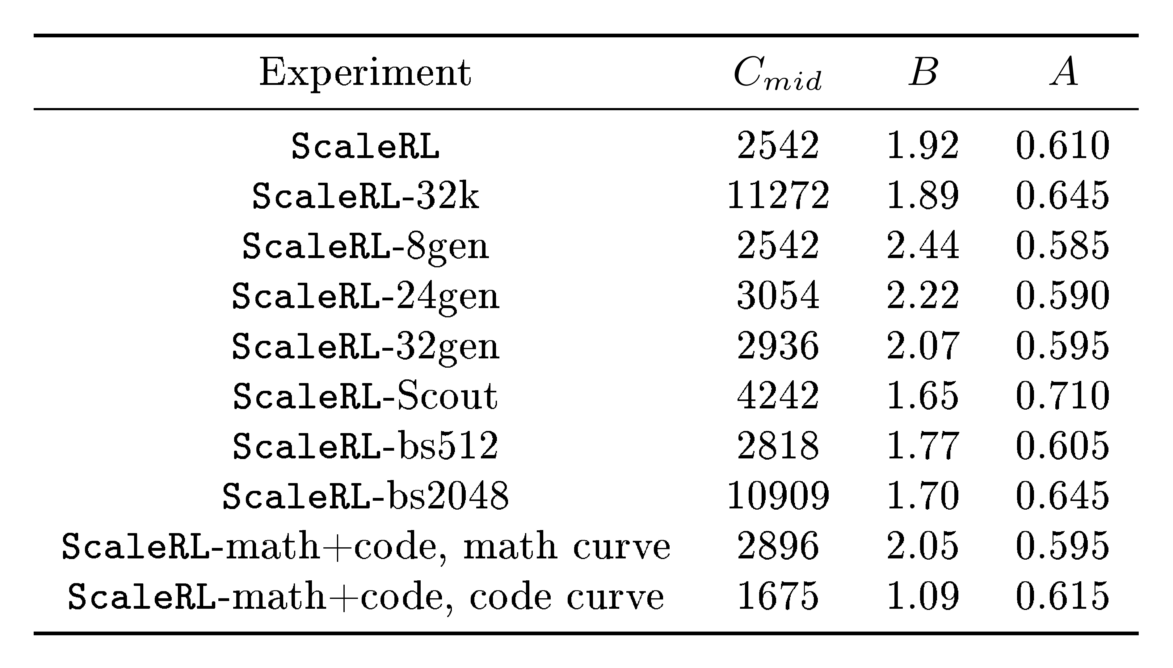 where $0 \le A \le 1$ represents the asymptotic pass rate, $B > 0$ is a scaling exponent that determines the compute efficiency, and $C_\text{mid}$ sets the midpoint of the RL performance curve. A schematic interpretation of these parameters is provided in Figure 6.