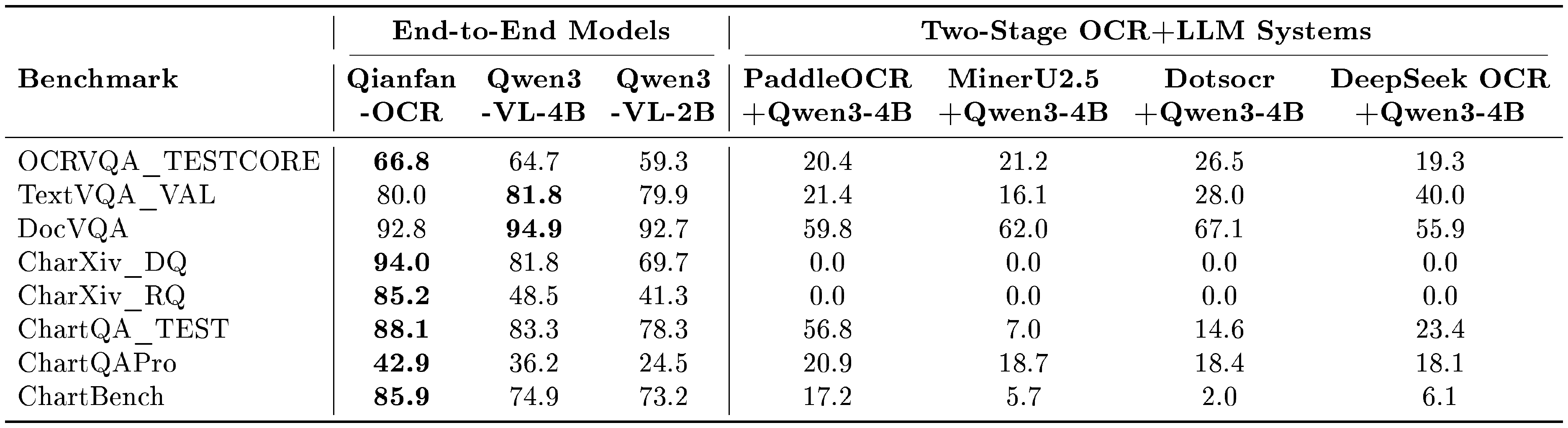::: {caption="Table 6: End-to-end models vs. two-stage OCR+LLM systems on document understanding benchmarks. Two-stage systems use Qwen3-4B as the downstream LLM. Best end-to-end results in bold."}