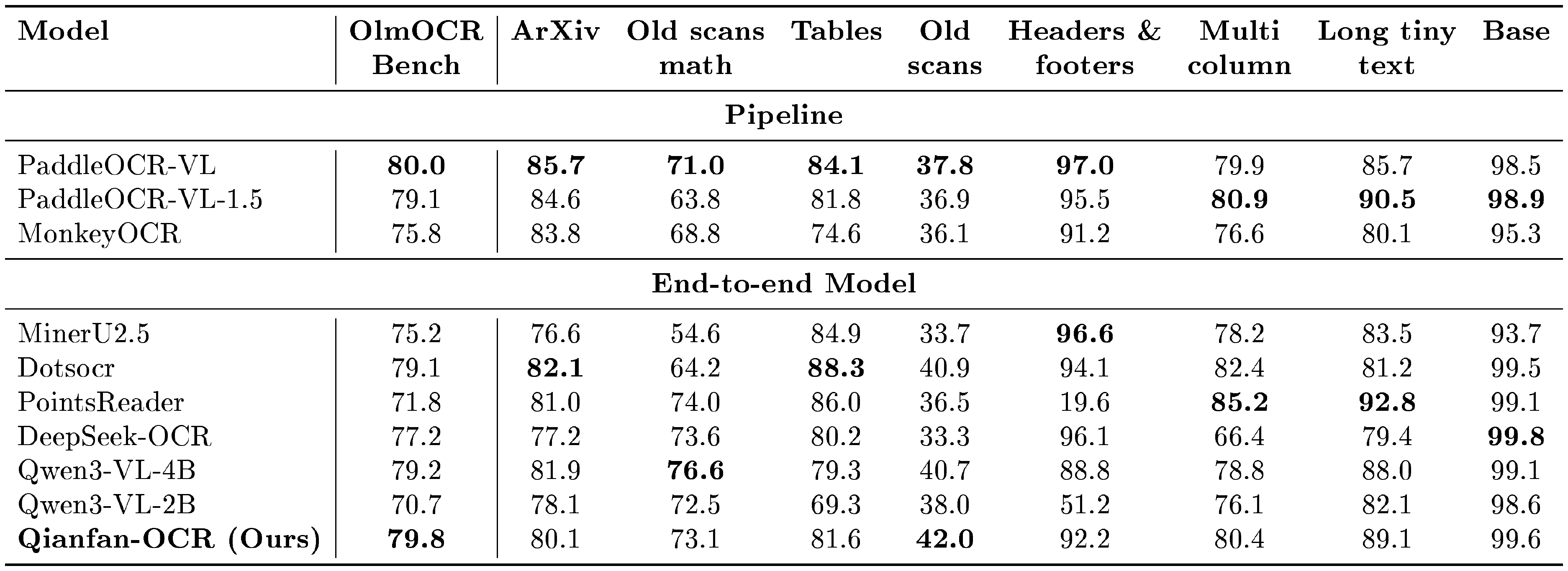 Table 3 presents detailed performance on OlmOCR Bench across document categories. Qianfan-OCR achieves the highest overall score (79.8) among end-to-end models, competitive with the top pipeline system PaddleOCR-VL (80.0), with strong scores on Base (99.6), Headers & footers (92.2), and Old scans (42.0, best among end-to-end).