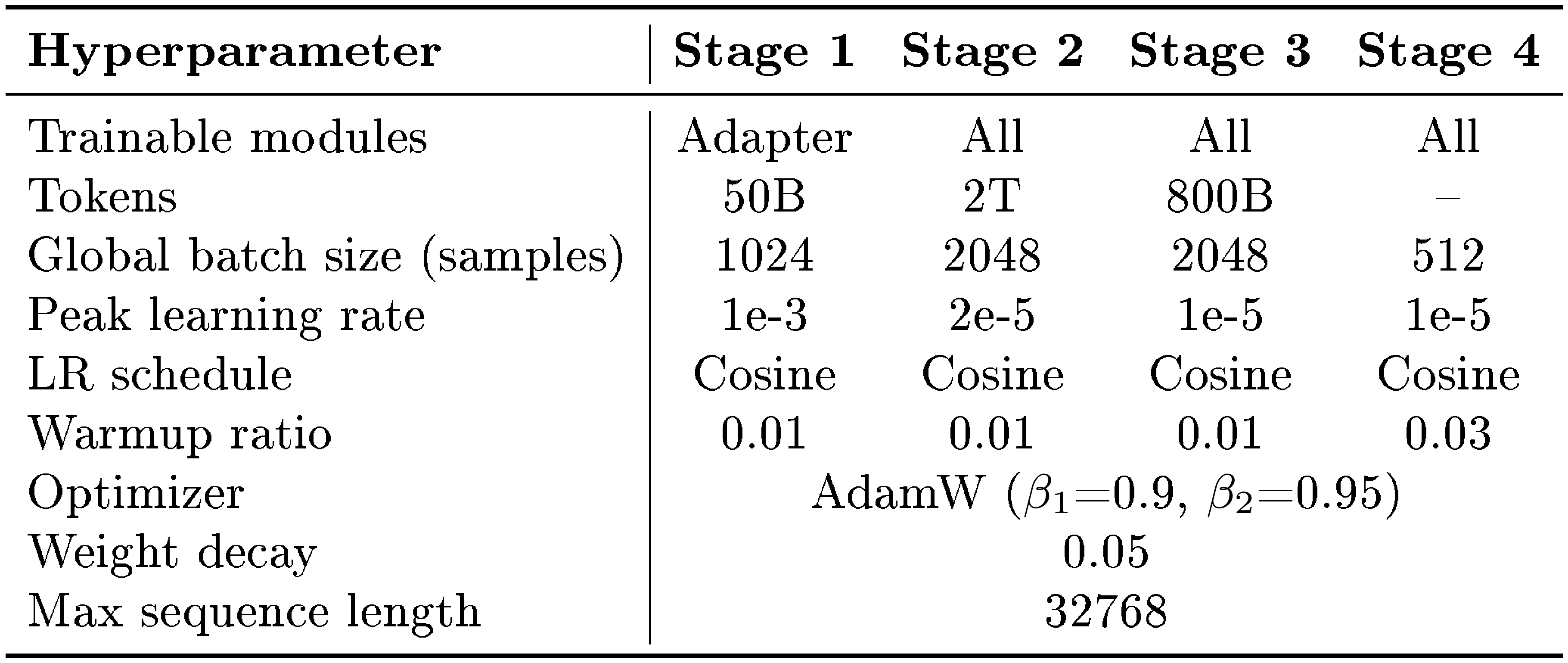 ::: {caption="Table 1: Training hyperparameters for each stage. Stage 1 trains only the adapter with a higher learning rate for fast alignment. Stages 2–4 use full-parameter training with lower learning rates."}