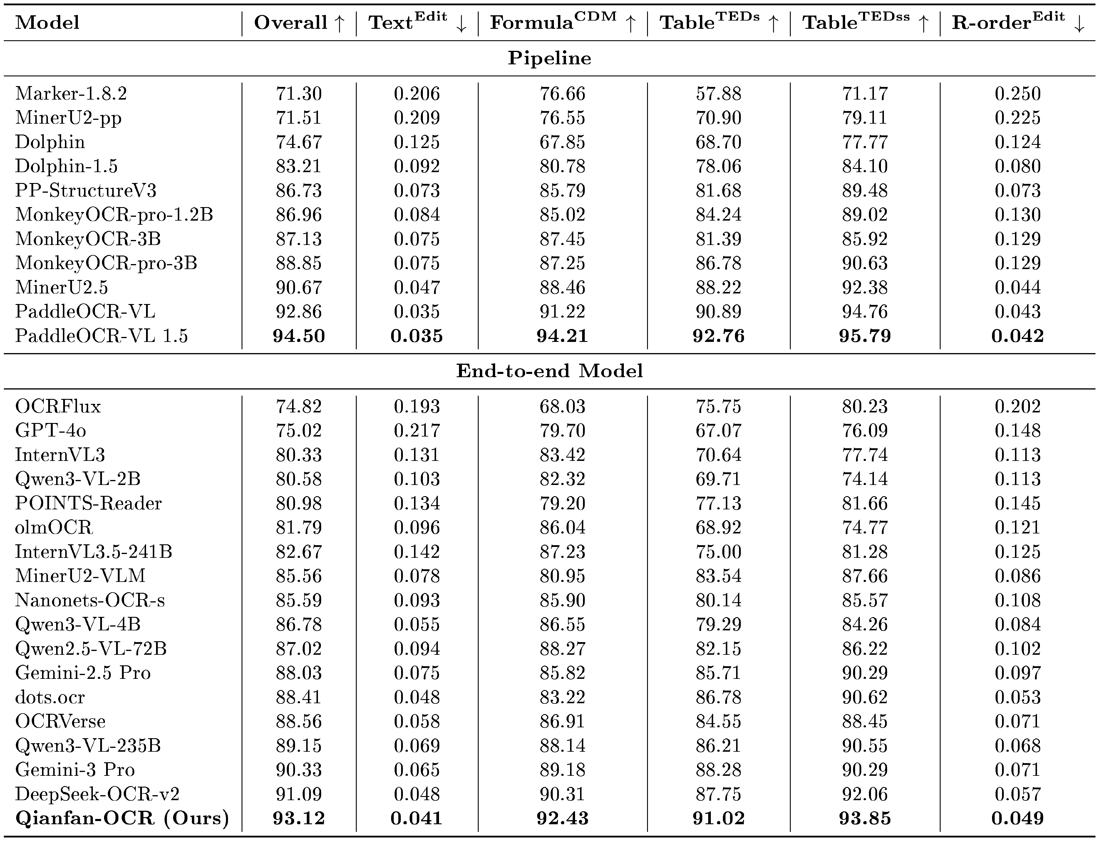 Table 4 presents results on OmniDocBench v1.5. Among end-to-end models, Qianfan-OCR achieves the highest overall score of 93.12, surpassing DeepSeek-OCR-v2 (91.09), Gemini-3 Pro (90.33), and all other end-to-end models across every sub-metric. Notably, Qianfan-OCR also outperforms several pipeline systems including MinerU2.5 (90.67) and MonkeyOCR-pro-3B (88.85), narrowing the gap with the top pipeline system PaddleOCR-VL 1.5 (94.50).