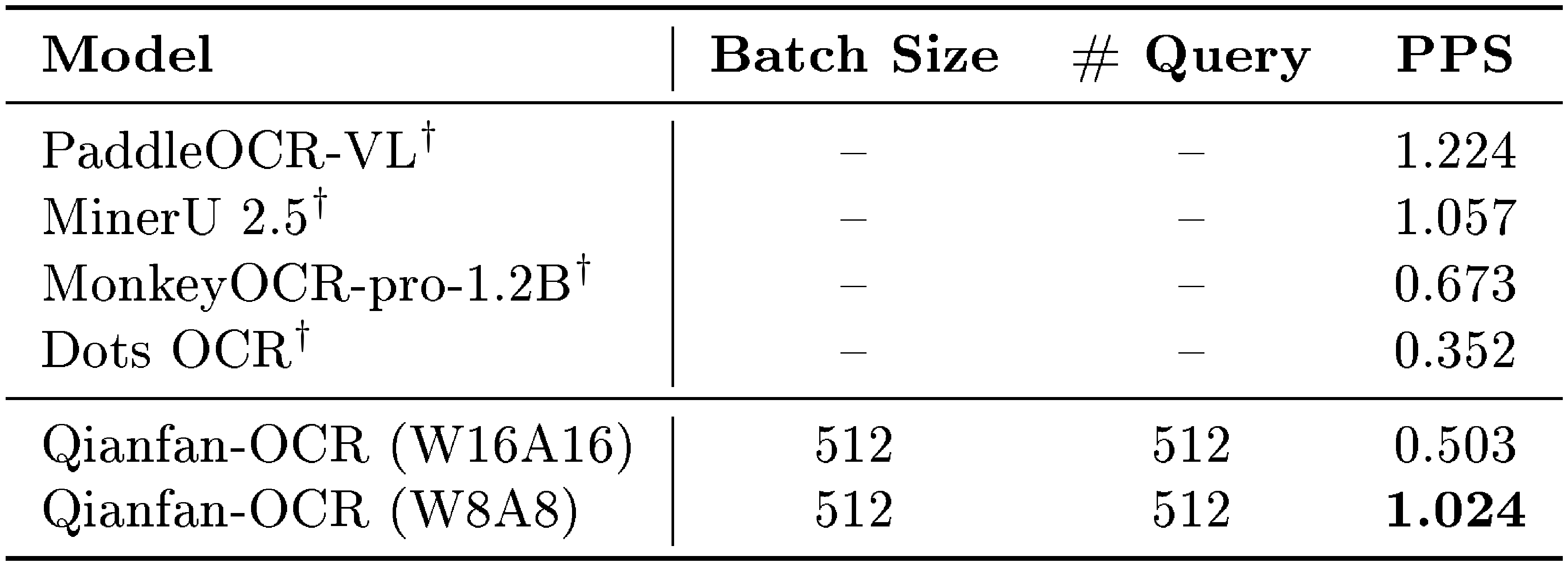 As shown in Table 8, despite having a 4B-parameter language model backbone – substantially larger than the detection and recognition modules in pipeline systems – Qianfan-OCR with W8A8 quantization achieves 1.024 PPS, comparable to PaddleOCR-VL (1.224 PPS) and exceeding MonkeyOCR-pro-1.2B (0.673 PPS) and Dots OCR (0.352 PPS).