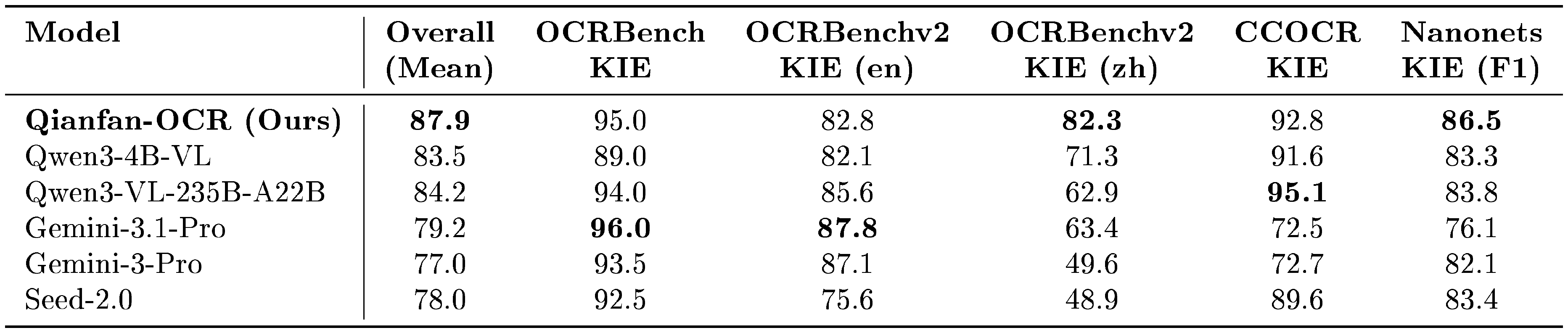Key Information Extraction (KIE): We evaluate KIE capabilities across five public benchmarks: OCRBench KIE ([18]) (structured field extraction from receipts, invoices, and forms), OCRBenchv2 KIE in both English and Chinese (cross-lingual extraction across diverse document templates), CCOCR KIE (Chinese document field extraction including ID cards, business licenses, and financial documents), and Nanonets KIE (real-world invoice and receipt parsing, measured by F1 score). All scores are normalized to a 0–100 scale. Since specialized OCR models lack native KIE capabilities, we compare against commercial large models (Gemini-3.1-Pro, Gemini-3-Pro, Seed-2.0) and open-source VLMs (Qwen3-4B-VL, Qwen3-VL-235B-A22B).