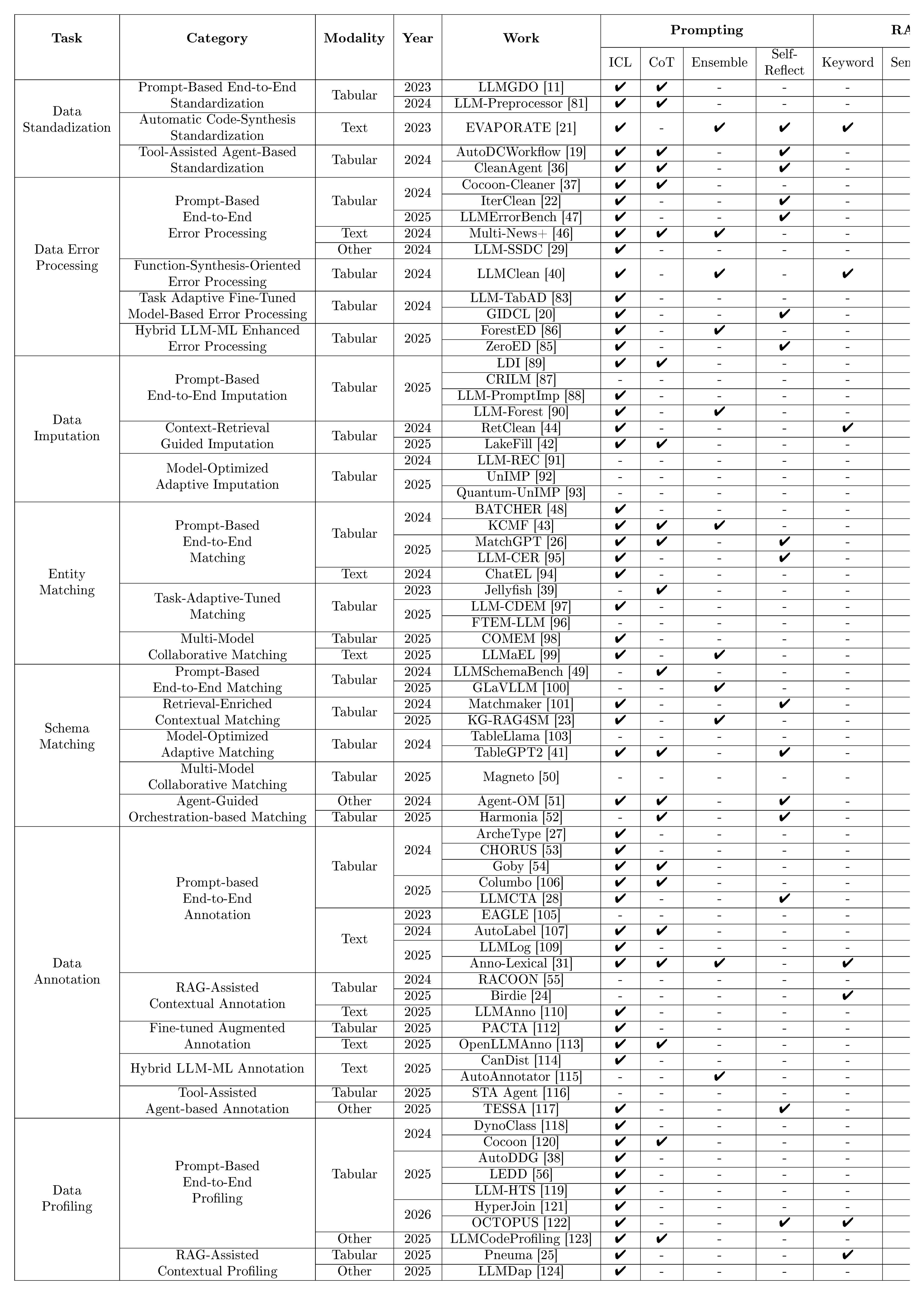 Table 1: Technique Overview of $\textsc{LLM}$-Enhanced $\textsc{Data Preparation}$ Methods.