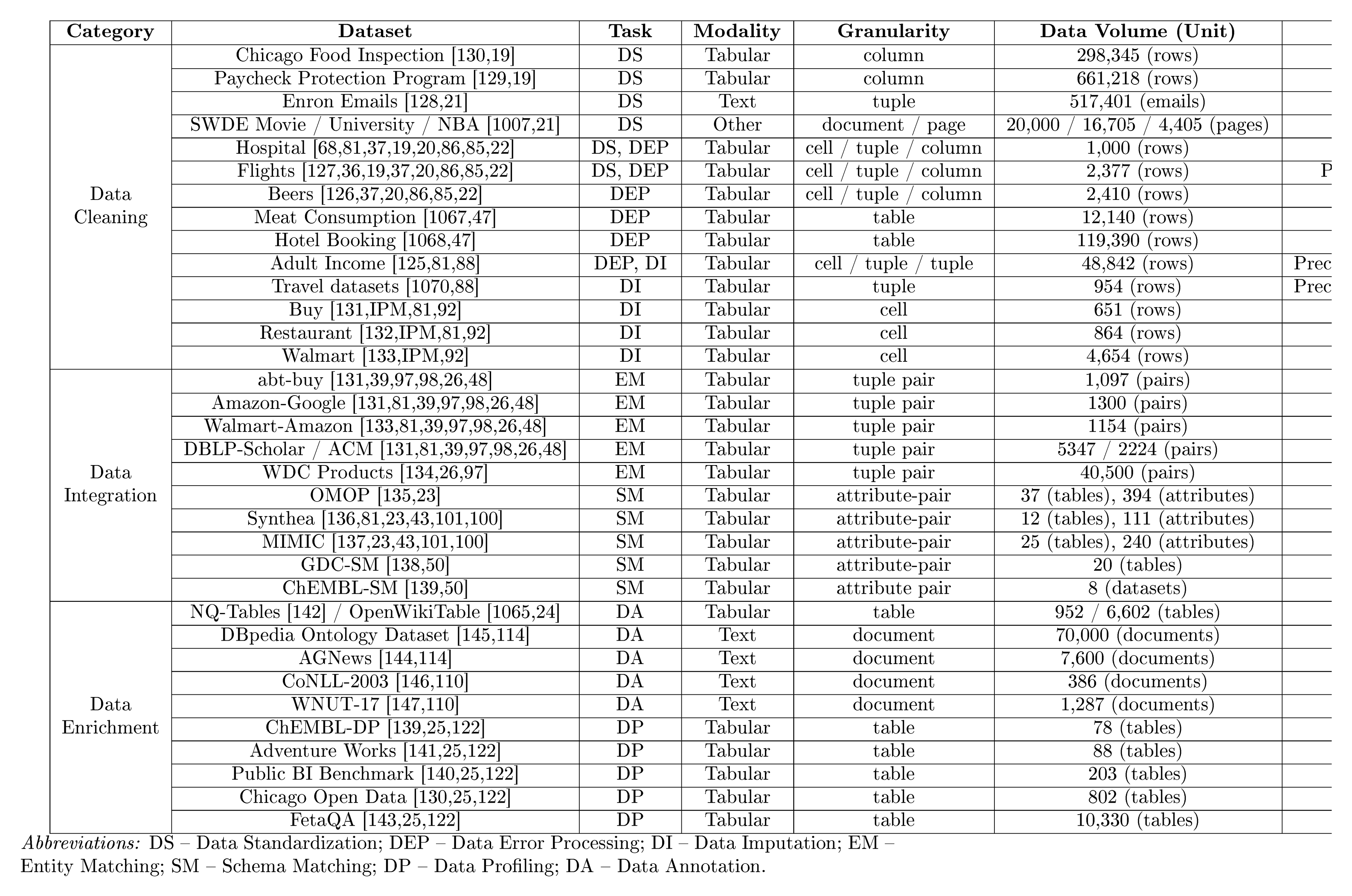 $\bullet$ Holistic vs. Limited Task Scope. We provide a comprehensive review of three fundamental data preparation tasks (cleaning, integration, enrichment) across diverse data modalities, including table and text. In contrast, existing surveys typically limit their scope to specific tasks [65, 57] or only the tabular modality [33, 62]