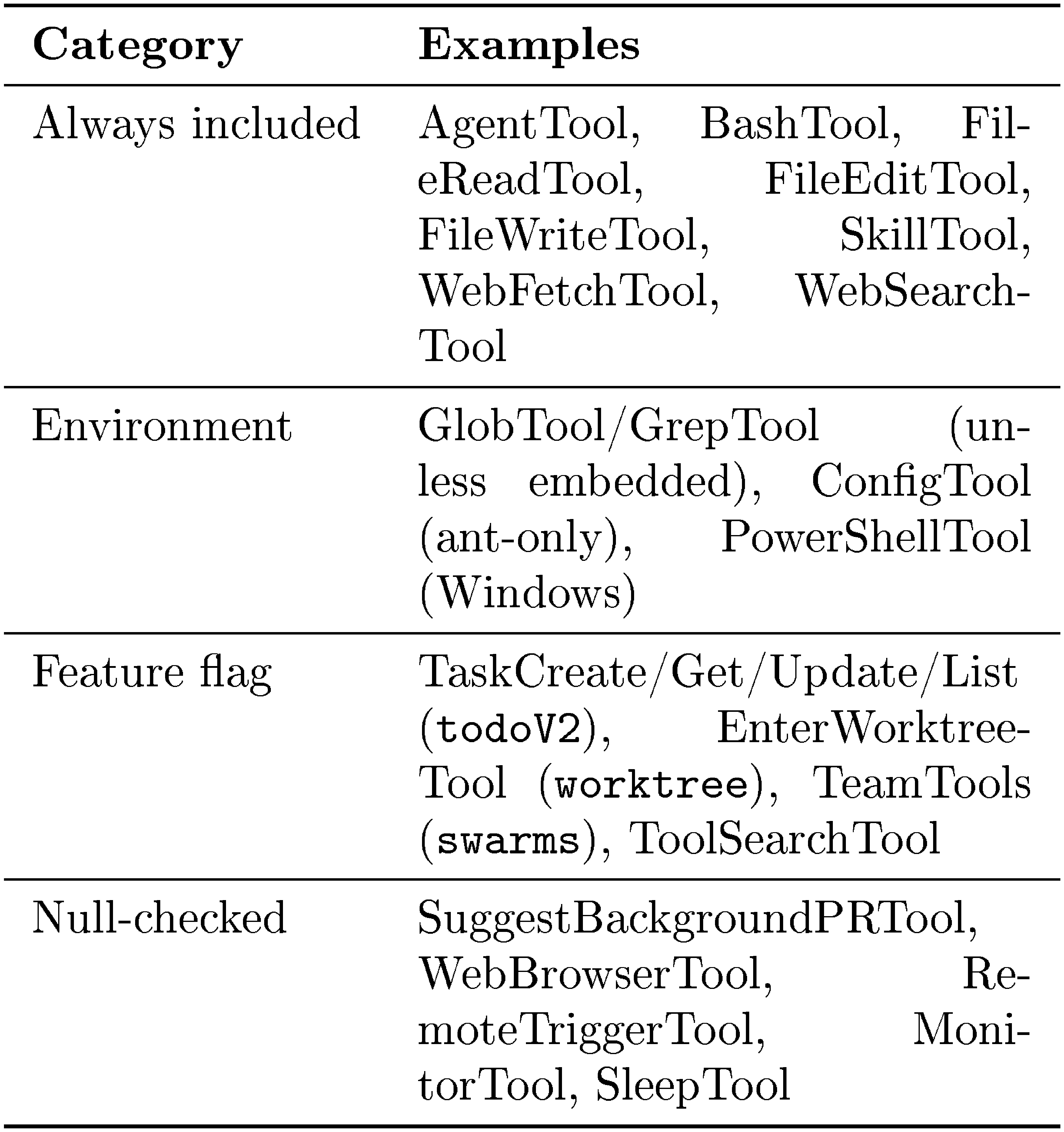 The permission system (permissions.ts) implements deny-first rule evaluation with up to seven permission modes (if also counting internal-only bubble and feature-gated auto) (types/permissions.ts) and an integrated auto-mode ML classifier (yoloClassifier.ts) that provides a two-stage fast-filter and chain-of-thought evaluation of tool safety (Section 5). A hook pipeline spanning 27 event types (coreTypes.ts; output schemas in types/hooks.ts) can block, rewrite, or annotate tool requests; of these, 5 are safety-related while the remaining 22 serve lifecycle and orchestration purposes (Section 6). An extensibility subsystem allows plugins and skills to register tools and hooks into the runtime. Tool pool assembly via assembleToolPool() (tools.ts) merges built-in and MCP-provided tools. Approved shell commands pass through a shell sandbox (shouldUseSandbox.ts) that restricts filesystem and network access independently of the permission system. Subagent spawning via AgentTool (AgentTool.tsx, runAgent.ts) is dispatched through the same buildTool() factory as all other tools, re-entering the queryLoop() with an isolated context window and returning only a summary to the parent (Section 8).