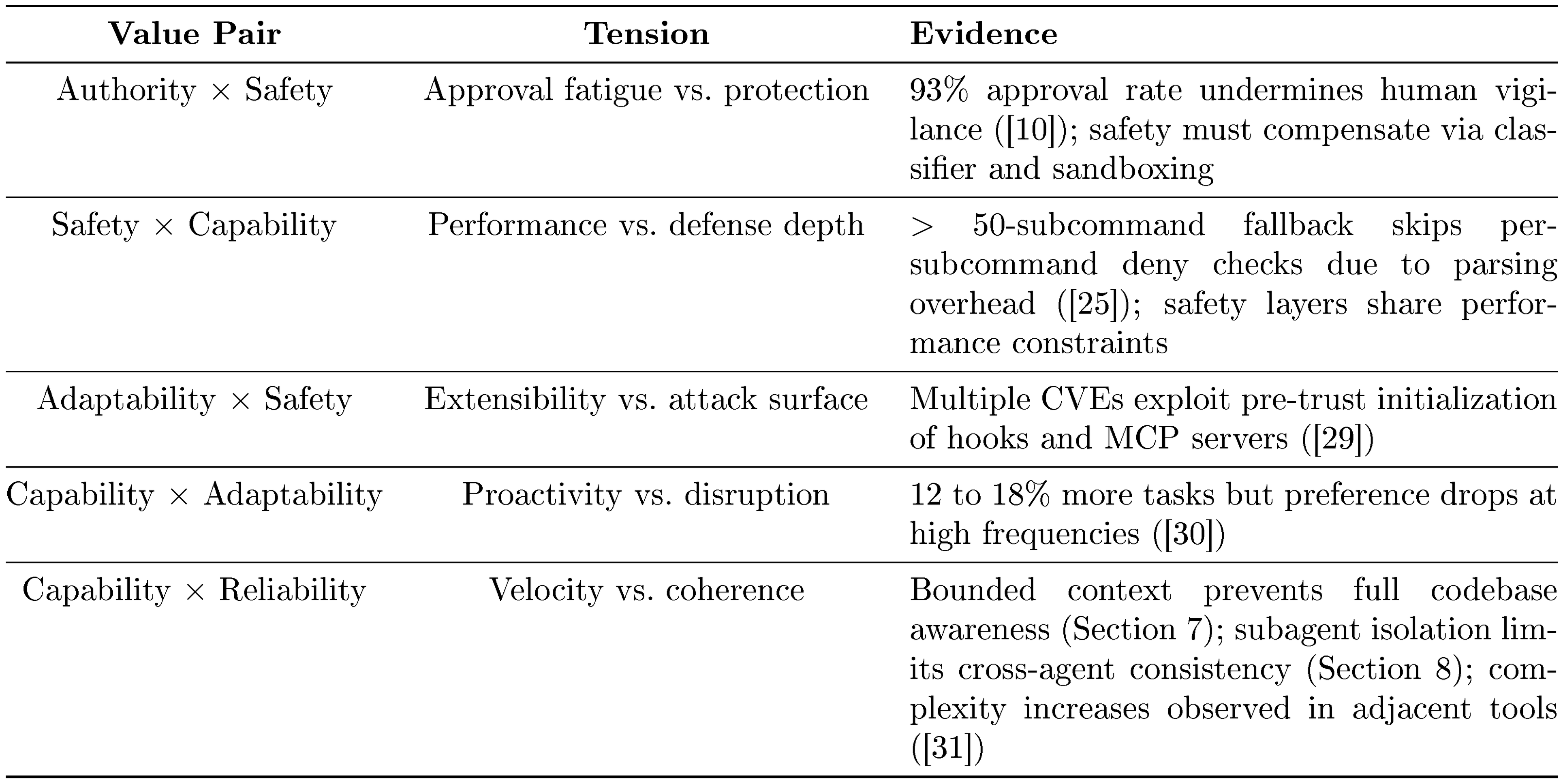 The five values above describe what the architecture is designed to serve. This paper also applies a sixth concern, whether the architecture preserves long-term human capability, as an evaluative lens. This concern is real: Anthropic's own study of 132 engineers and researchers ([5]) documents a "paradox of supervision" in which overreliance on AI risks atrophying the skills needed to supervise it, and independent research ([21]) finds that developers in AI-assisted conditions score 17% lower on comprehension tests. However, this concern is not prominently reflected as a design driver in the architecture or in Anthropic's stated design values. We therefore treat it not as a co-equal value but as a cross-cutting concern: a question applied across all five values in Section 11, asking whether short-term amplification comes at the cost of long-term human understanding, codebase coherence, and the developer pipeline.