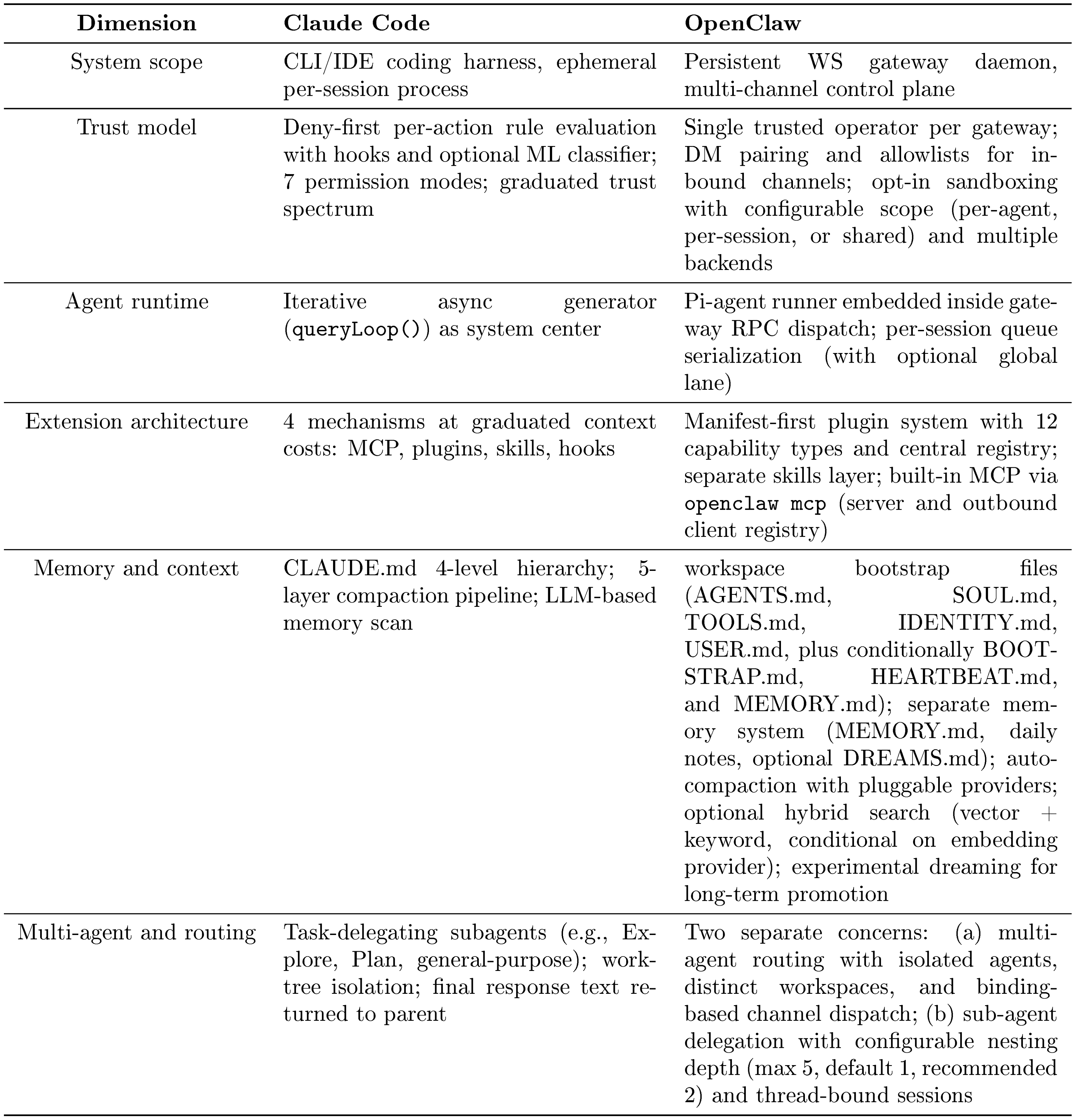 These mappings also reveal what the architecture does not do: it does not impose explicit planning graphs on the model's reasoning, does not provide a single unified extension mechanism, and does not restore all session-scoped trust-related state across resume. These absences are consistent with the principle set above.