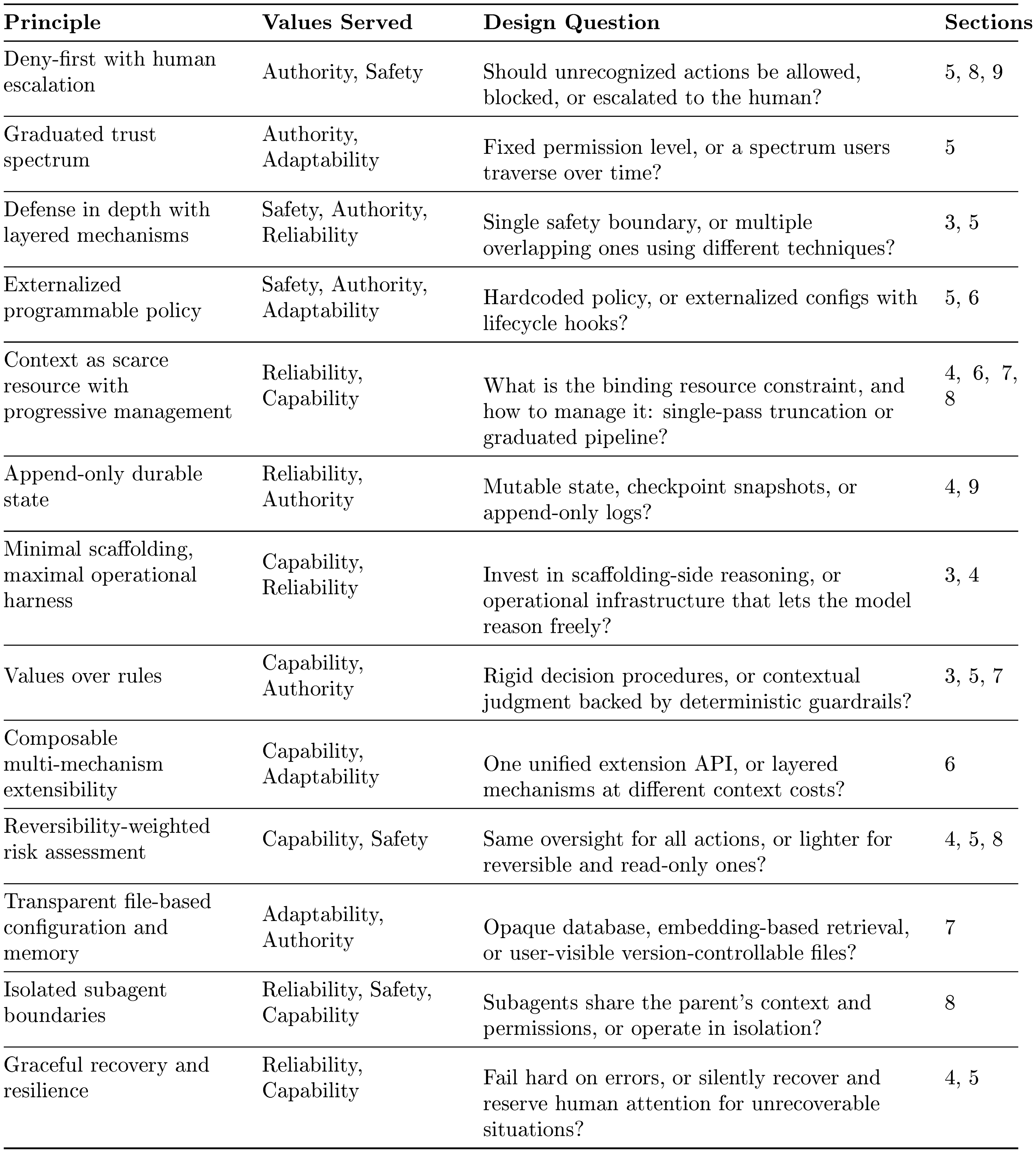 These values are operationalized through thirteen design principles, each answering a recurring question that production coding agents must resolve. Table 1 summarizes the principles; subsequent sections (Section 3–Section 9) trace each through specific implementation choices.