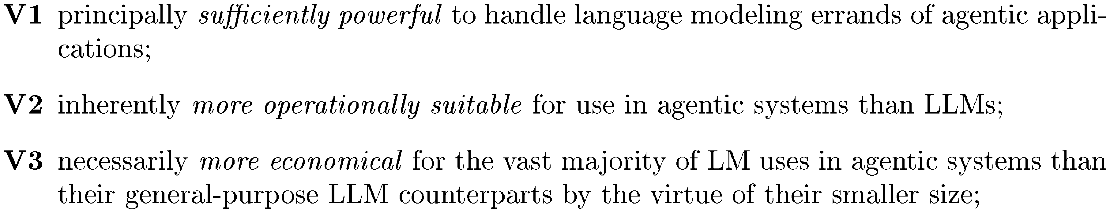 We assert that the dominance of LLMs in the design of AI agents is both excessive and misaligned with the functional demands of most agentic use cases. While LLMs offer impressive generality and conversational fluency, the majority of agentic subtasks in deployed agentic systems are repetitive, scoped, and non-conversational—calling for models that are efficient, predictable, and inexpensive. In this context, SLMs not only suffice, but are often preferable. They offer several advantages: lower latency, reduced memory and computational requirements, and significantly lower operational costs, all while maintaining adequate task performance in constrained domains.