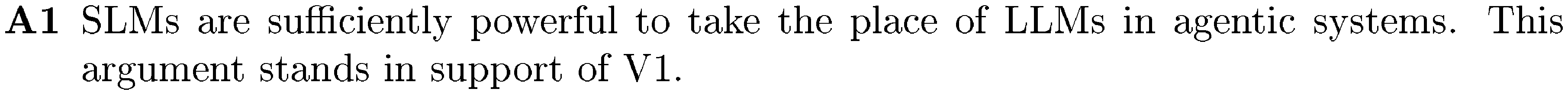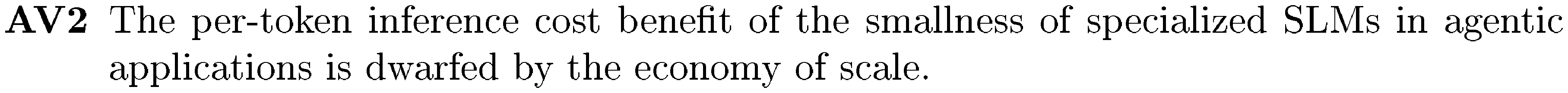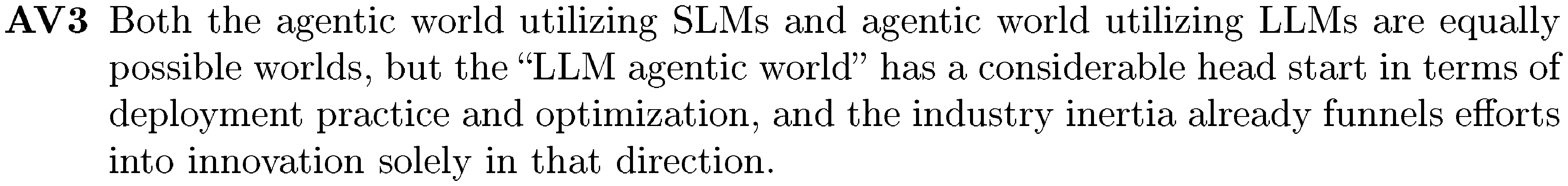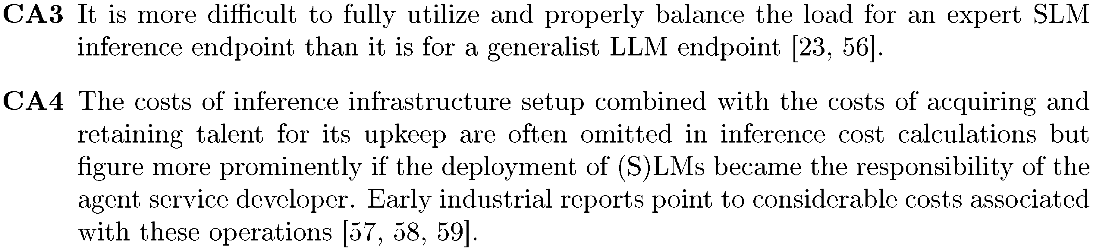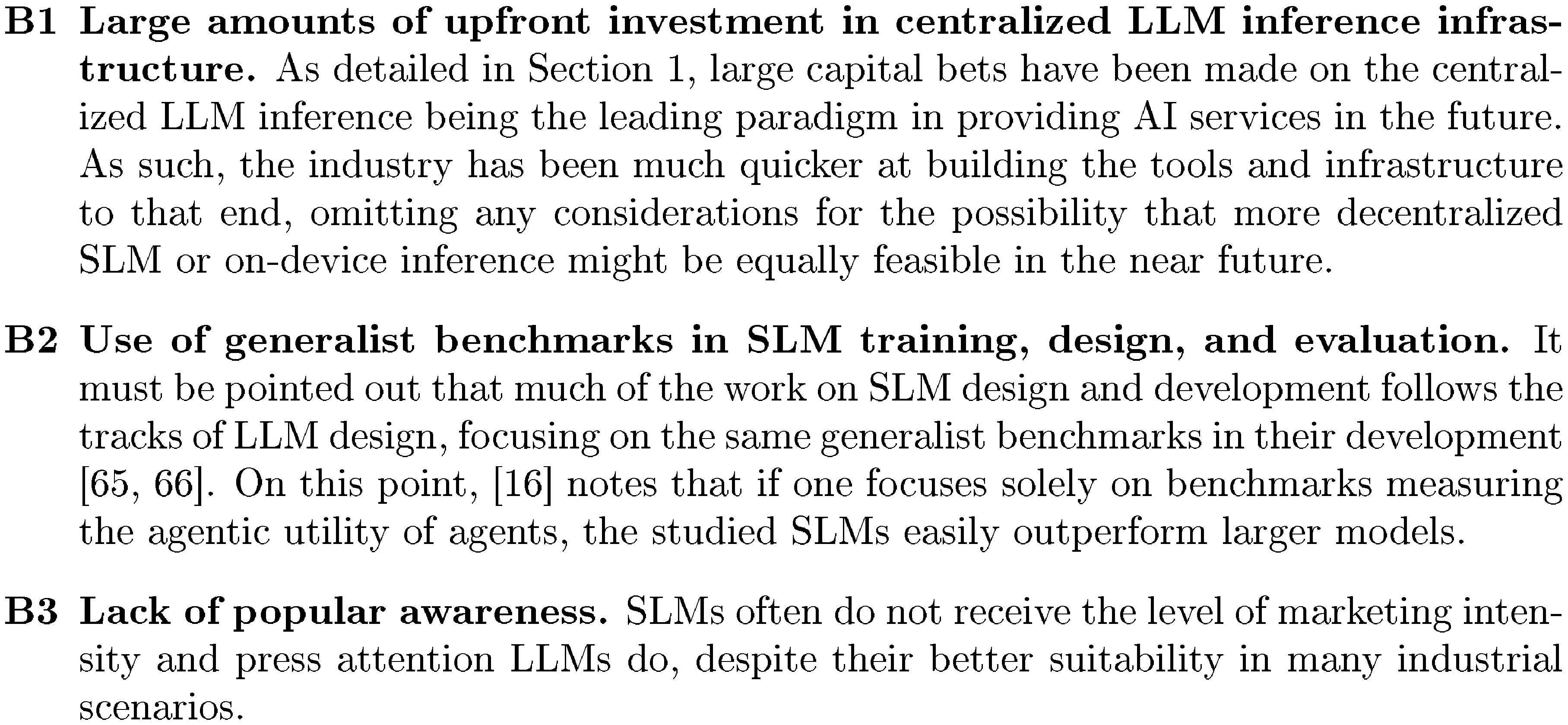 We note that B1, B2, and B3 are practical hurdles and far from being fundamental flaws of the SLM technology in the context of agentic AI. With advanced inference scheduling systems such as Dynamo [27], B1 is being reduced to a mere effect of inertia. B2 is becoming increasingly recognized in the field [16, 12], and it would be natural for B3 to fall once the economic benefits of SLM deployment in agentic applications (A2) are better known. With the inertia of B1 in particular, we do not endeavor to give a timeline for the retreat of these barriers or the popular adoption of SLMs.