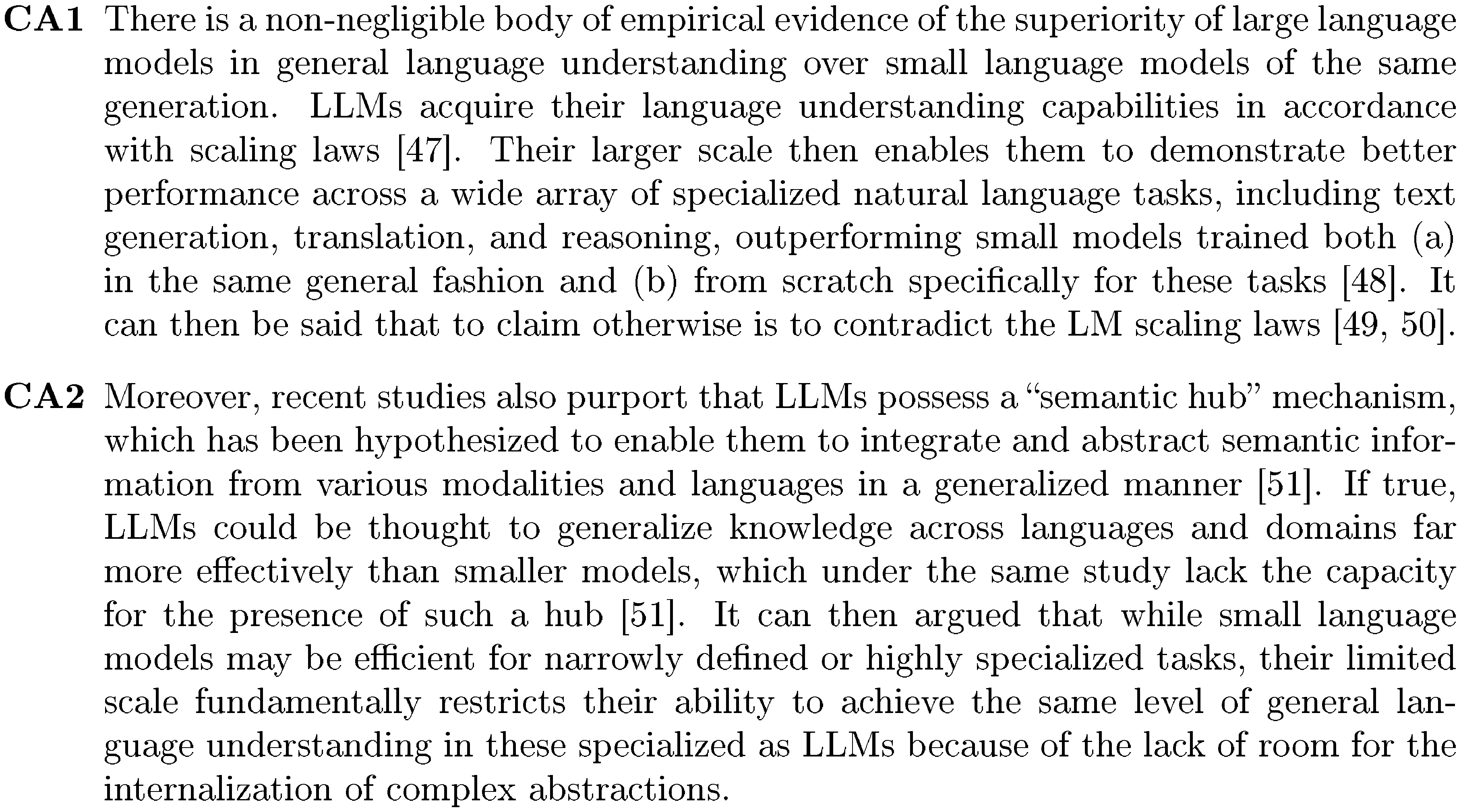Section Summary: This section explores alternative perspectives in academic and popular discussions that challenge the advantages of small language models (SLMs) over large language models (LLMs). One view argues that LLMs will always outperform SLMs on any language task due to their broader understanding, though the authors rebut this as overly narrow or complex reasoning. Another suggests LLMs remain cheaper to run through centralized operations, which the authors partially accept as case-specific but counter with emerging factors favoring SLMs, while a third posits equally viable futures for both, yet the authors believe SLMs' multiple strengths could shift the balance.