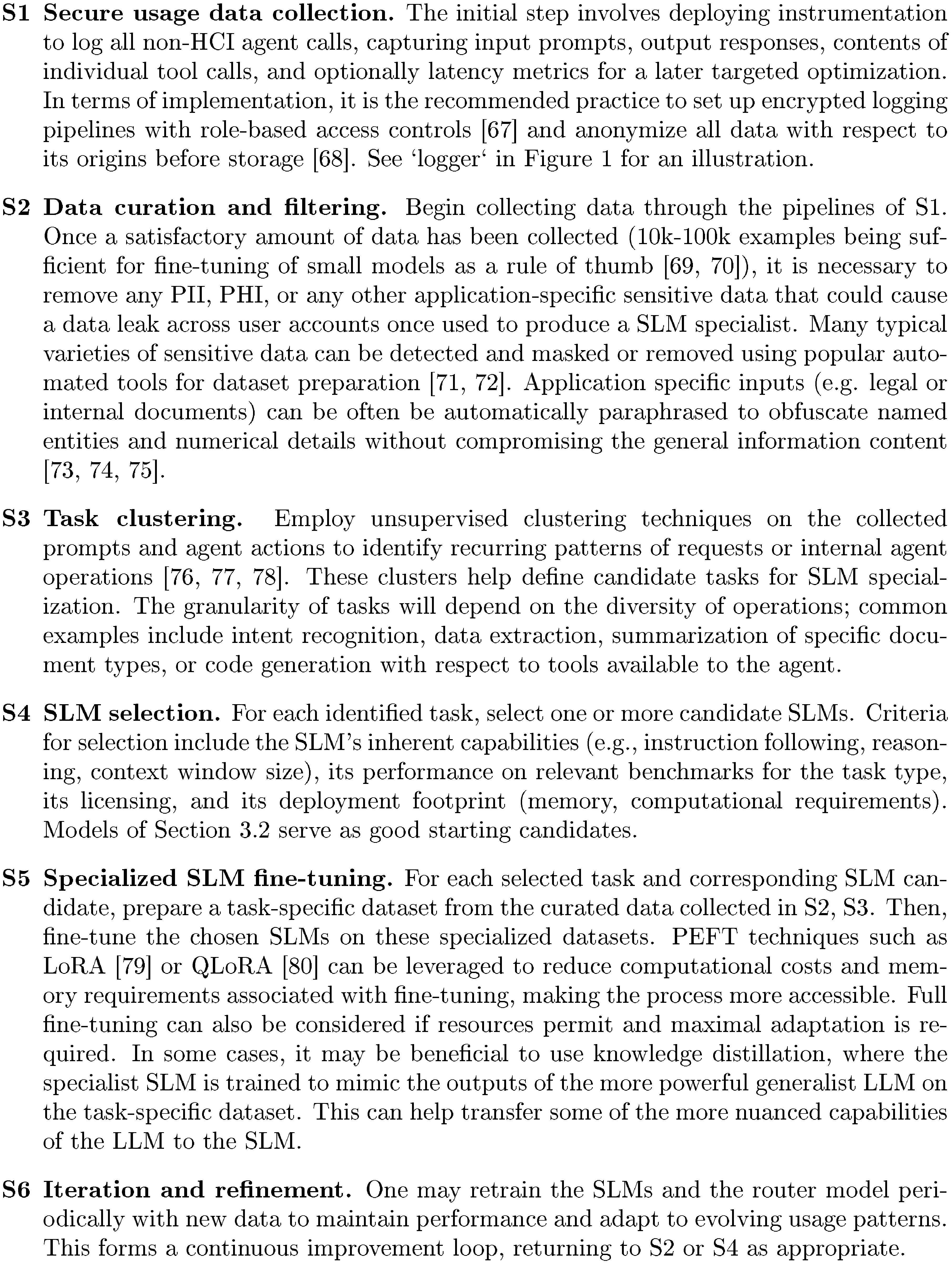 As noted in Section 3.4, invocations of tools and language models during an agentic process are often accompanied by careful prompting that focuses the language model on delivering the narrow functionality that is required at the time. Each one of these invocations is itself a natural source of data for future improvement (under the necessary assumption that no non-retainable confidential data is being processed). A listener decorating the tool/model call interface can gather specialized instruction data that can later be used to produce a fine-tune an expert SLM and lower the cost of that call in the future (see logger in Figure 1). We argue that this avenue is enabled by the architecture of agents [4] and produces high-quality organic data (that can be further post-filtered by considering the overall success of the workflow), thus making the production of expert SLMs to stand in place of LLMs a natural step in agent deployment — not just an auxiliary effort.