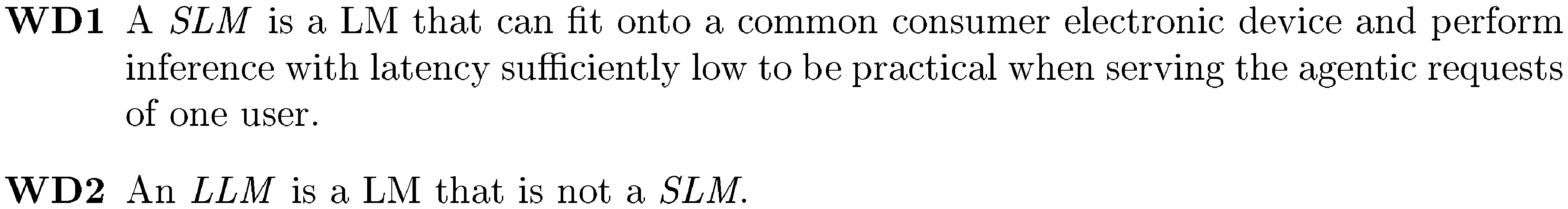 We justify the wording of these definitions in Appendix A, but note that their choice has little bearing on the essence of our position. We note that as of 2025, we would be comfortable with considering most models below 10bn parameters in size to be SLMs.