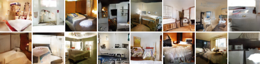 We run experiments on image generation. The target distribution to learn is the LSUN-Bedrooms dataset [10] – a collection of natural images of indoor bedrooms. Our baseline comparison is DCGAN [11], a GAN with a convolutional architecture trained with the standard GAN procedure using the $-\log D$ trick [5]. The generated samples are 3-channel images of 64x64 pixels in size. We use the hyper-parameters specified in Algorithm 1 for all of our experiments.