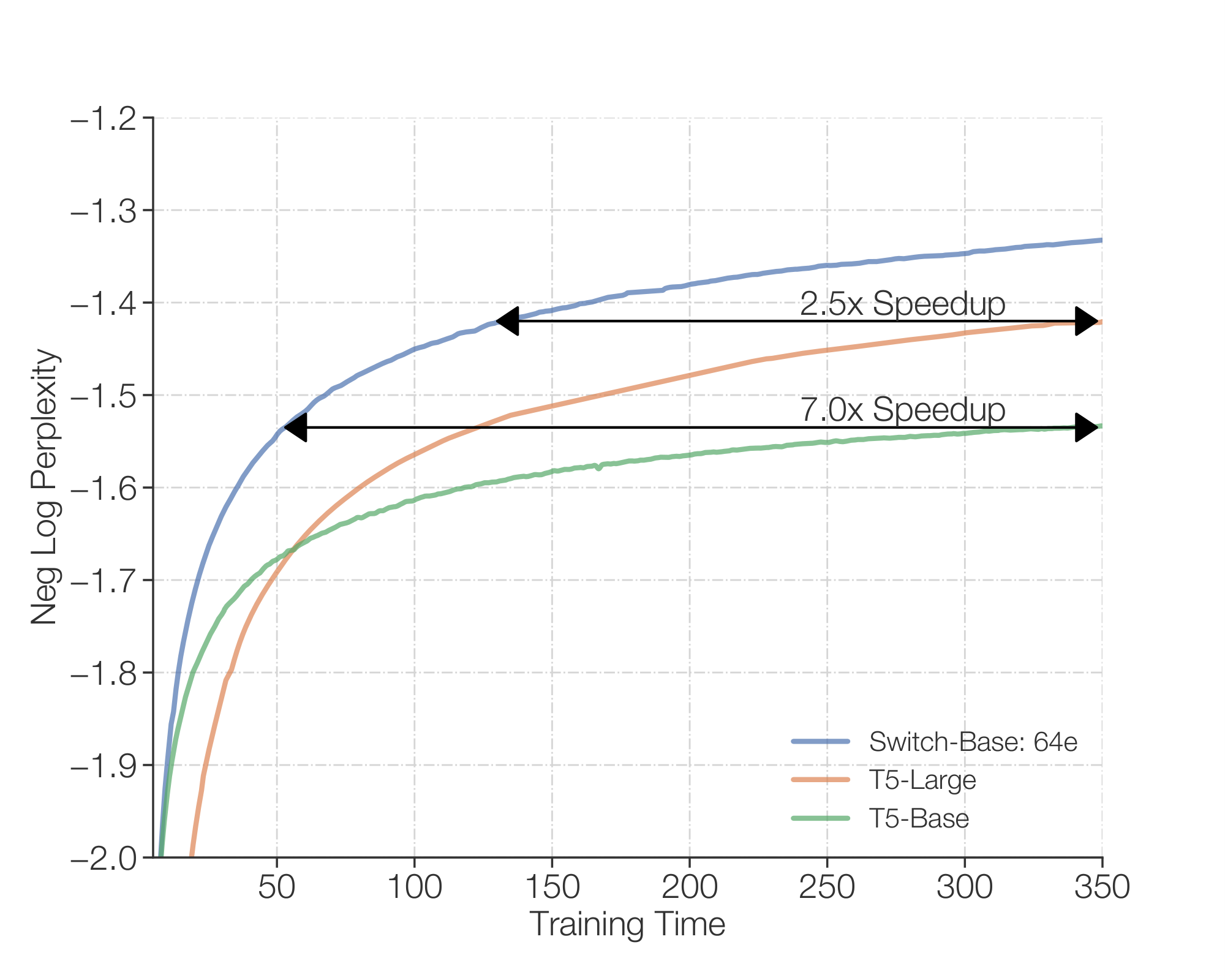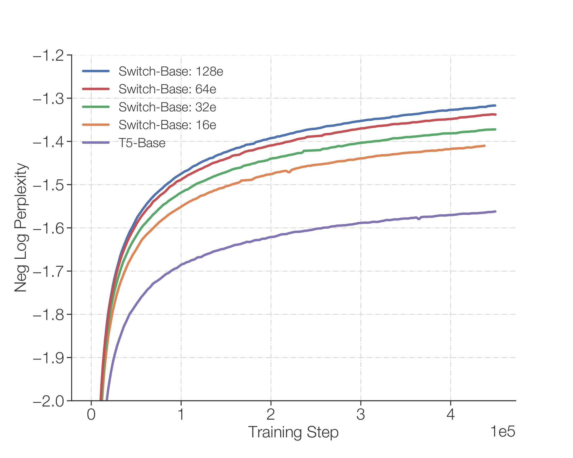 Table 1: Benchmarking Switch versus MoE. Head-to-head comparison measuring per step and per time benefits of the Switch Transformer over the MoE Transformer and T5 dense baselines. We measure quality by the negative log perplexity and the time to reach an arbitrary chosen quality threshold of Neg. Log Perp.=-1.50. All MoE and Switch Transformer models use 128 experts, with experts at every other feed-forward layer. For Switch-Base+, we increase the model size until it matches the speed of the MoE model by increasing the model hidden-size from 768 to 896 and the number of heads from 14 to 16. All models are trained with the same amount of computation (32 cores) and on the same hardware (TPUv3). Further note that all our models required pre-training beyond 100k steps to achieve our level threshold of -1.50. † T5-Base did not achieve this negative log perplexity in the 100k steps the models were trained.