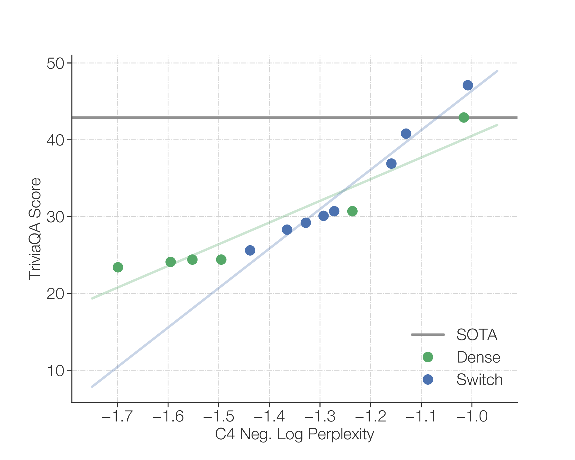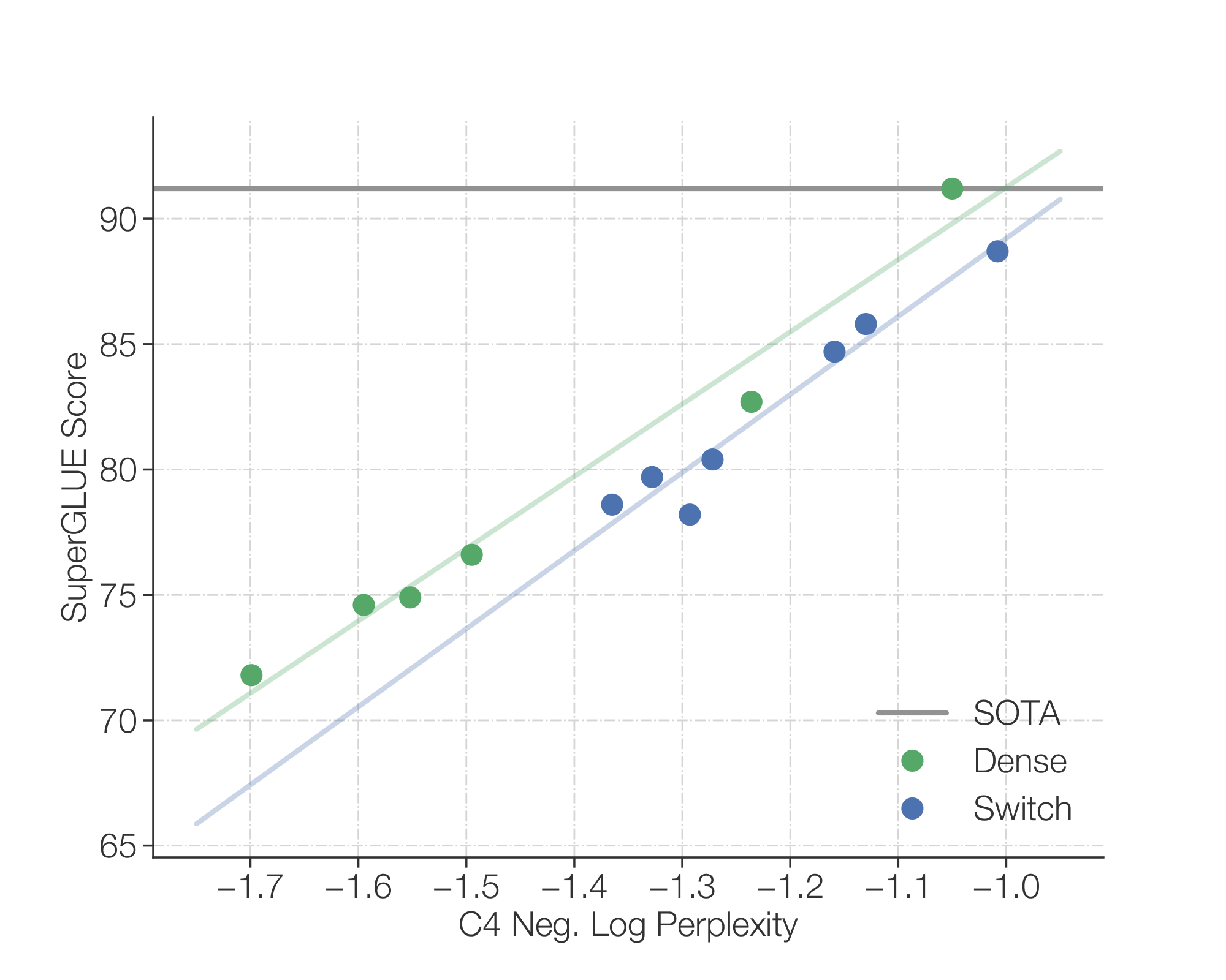 Figure 13: Upstream pre-trained quality to downstream model quality. We correlate the upstream performance with downstream quality on both SuperGLUE and TriviaQA (SOTA recorded without SSM), reasoning and knowledge-heavy benchmarks, respectively (validation sets). We find that, as with the baseline, the Switch model scales with improvements in the upstream pre-training task. For SuperGLUE, we find a loosely linear relation between negative log perplexity and the average SuperGLUE score. However, the dense model often performs better for a fixed perplexity, particularly in the large-scale regime. Conversely, on the knowledge-heavy task, TriviaQA, we find that the Switch Transformer may follow an improved scaling relationship – for a given upstream perplexity, it does better than a dense counterpart. Further statistics (expensive to collect and left to future work) would be necessary to confirm these observations.