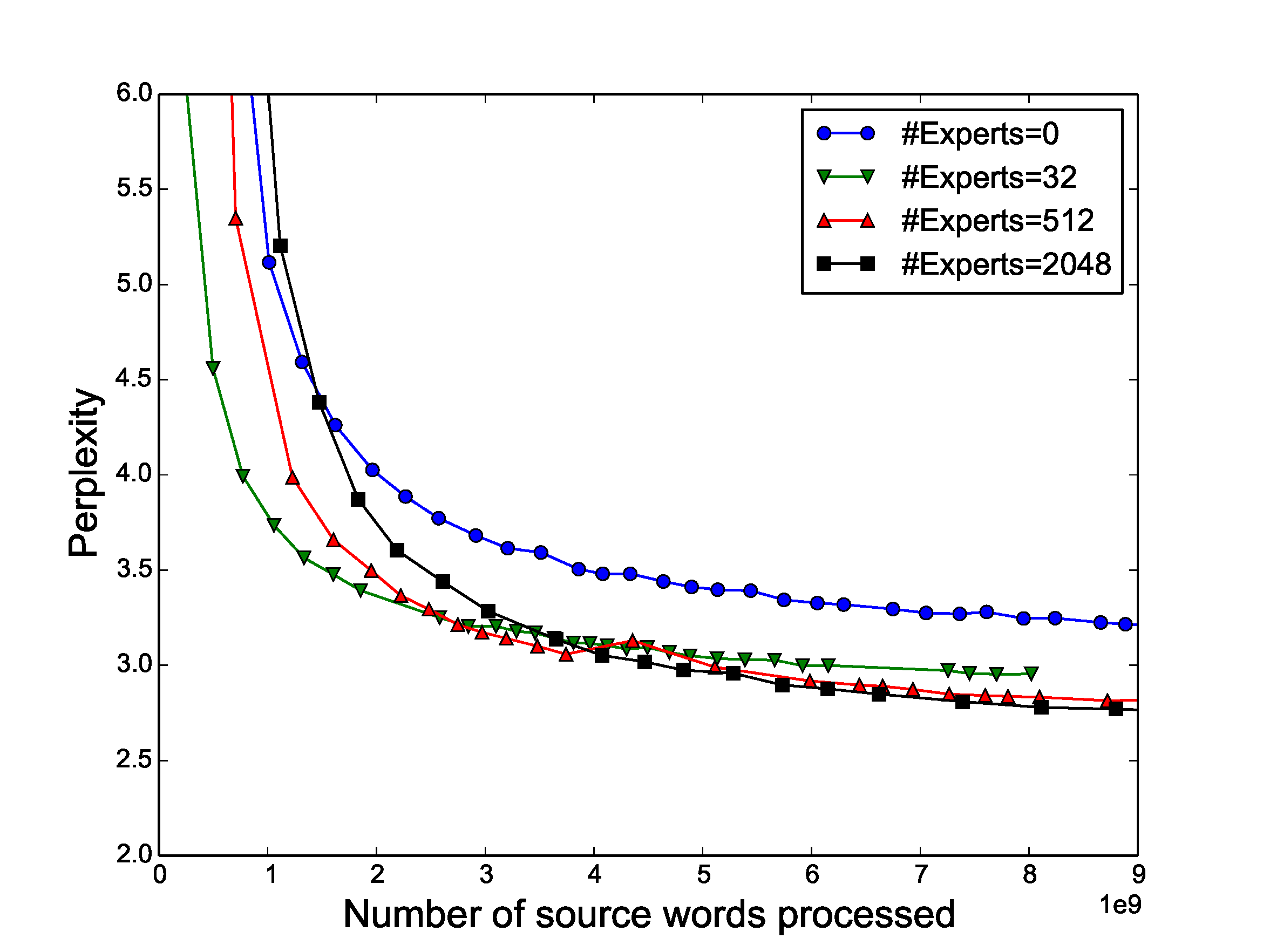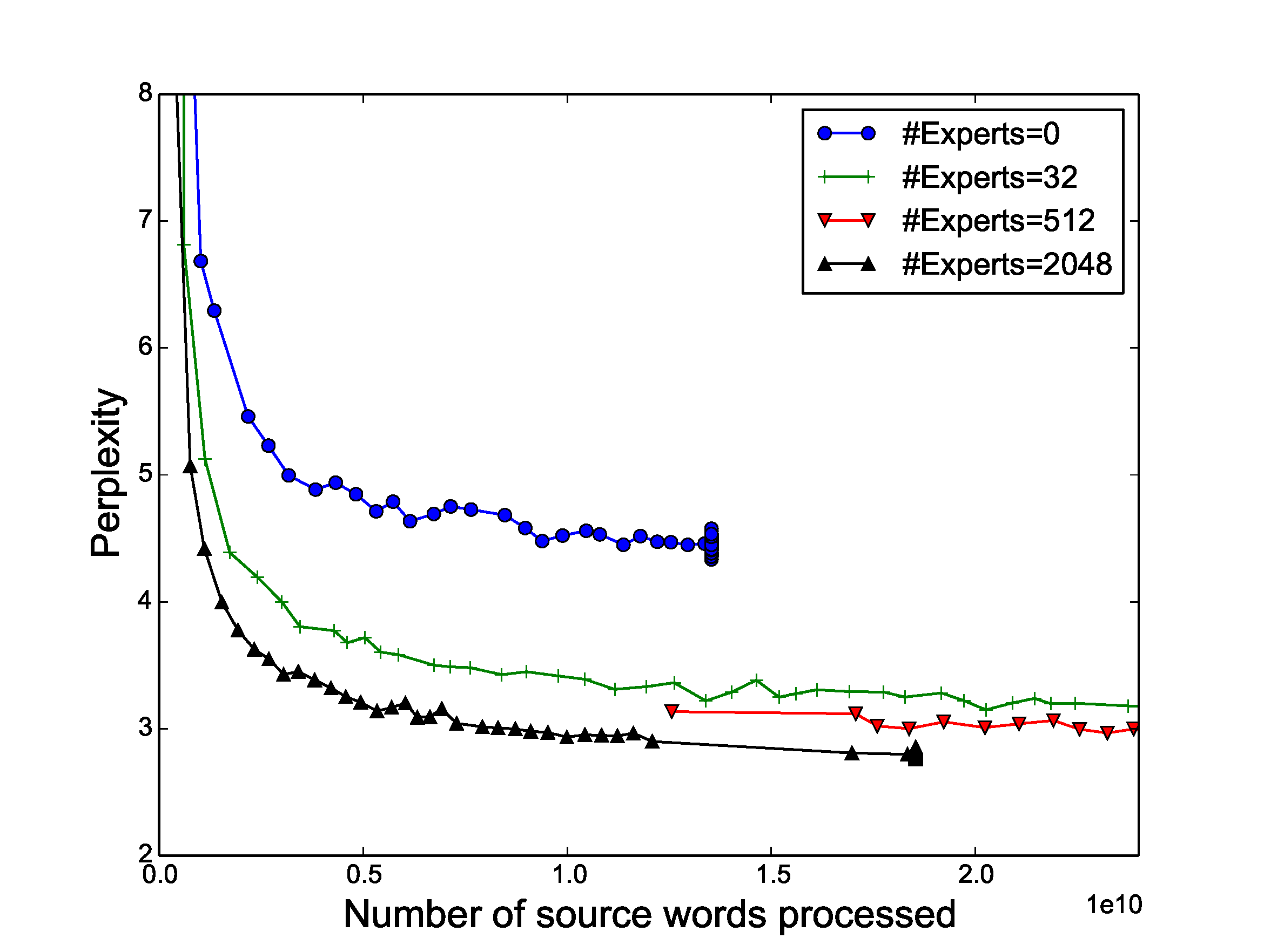 The results of these models are shown in Figure 2-left. The model with 4 always-active experts performed (unsurprisingly) similarly to the computationally-matched baseline models, while the largest of the models (4096 experts) achieved an impressive 24% lower perplexity on the test set.