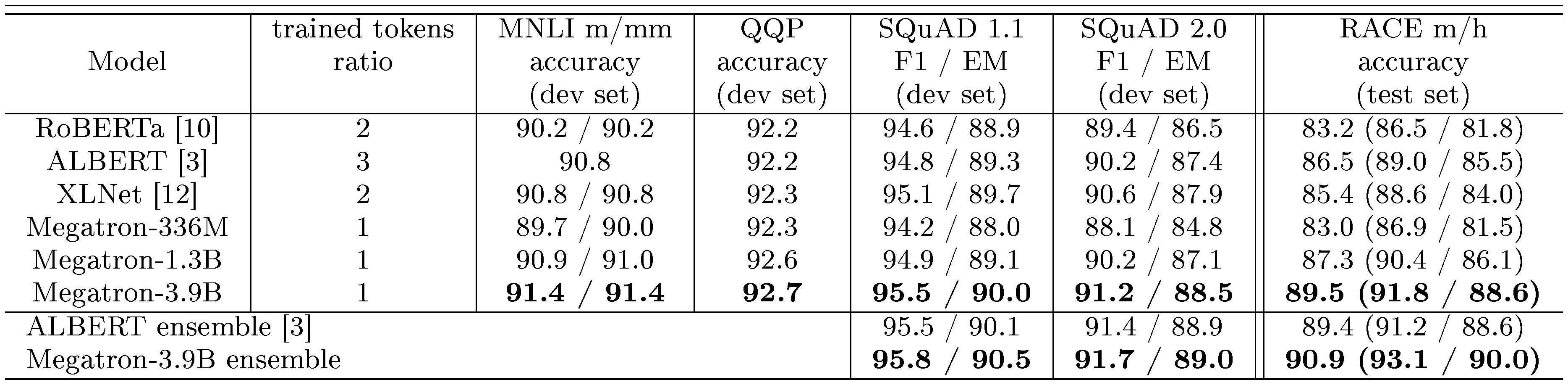 ::: {caption="Table 5: Development set results for MNLI, QQP, SQuAD 1.1 and SQuAD 2.0 and test set results for RACE. The trained tokens represents consumed tokens during model pretraining (proportional to batch size times number of iterations) normalized by consumed tokens during model pretraining for our 336M model."}