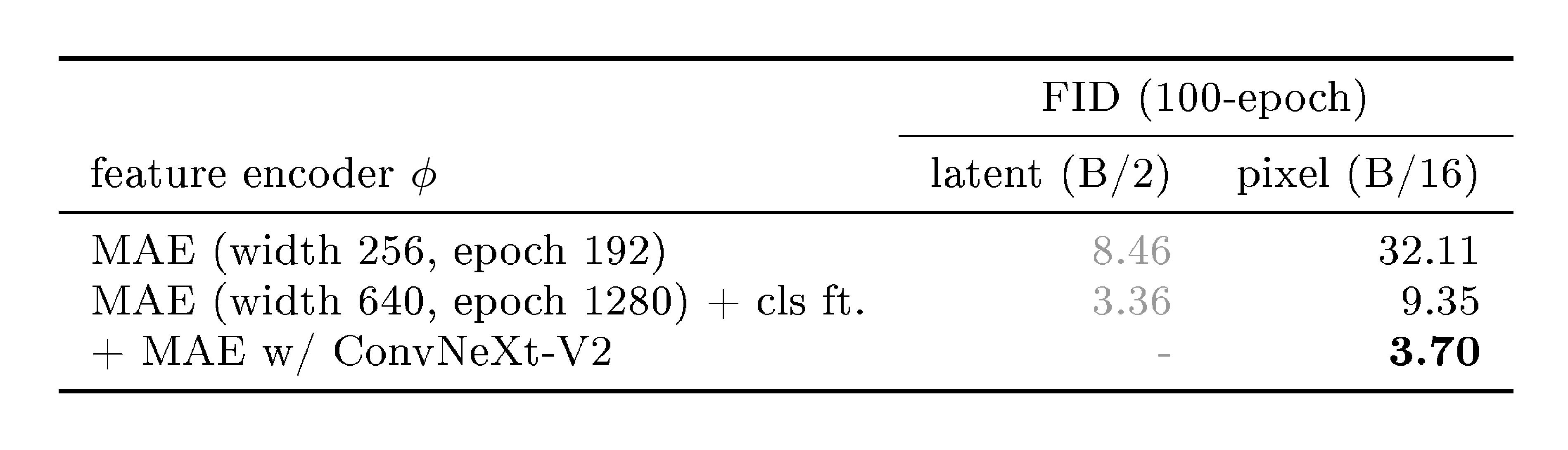 Our feature-space loss is related to perceptual loss [36] but is conceptually different. The perceptual loss minimizes: $|\phi(\mathbf{x})-\phi(\mathbf{x}\text{target})|2^2$, that is, the regression target is $\phi(\mathbf{x}\text{target})$ and requires pairing $\mathbf{x}$ with its target. In contrast, our regression target in Equation (10) is $\phi(\mathbf{x}) + \mathbf{V}\big(\phi(\mathbf{x})\big)$, where the drifting is in the feature space and requires no pairing. In principle, our feature-space loss aims to match the pushforward distributions $\phi#q$ and $\phi_#p$.