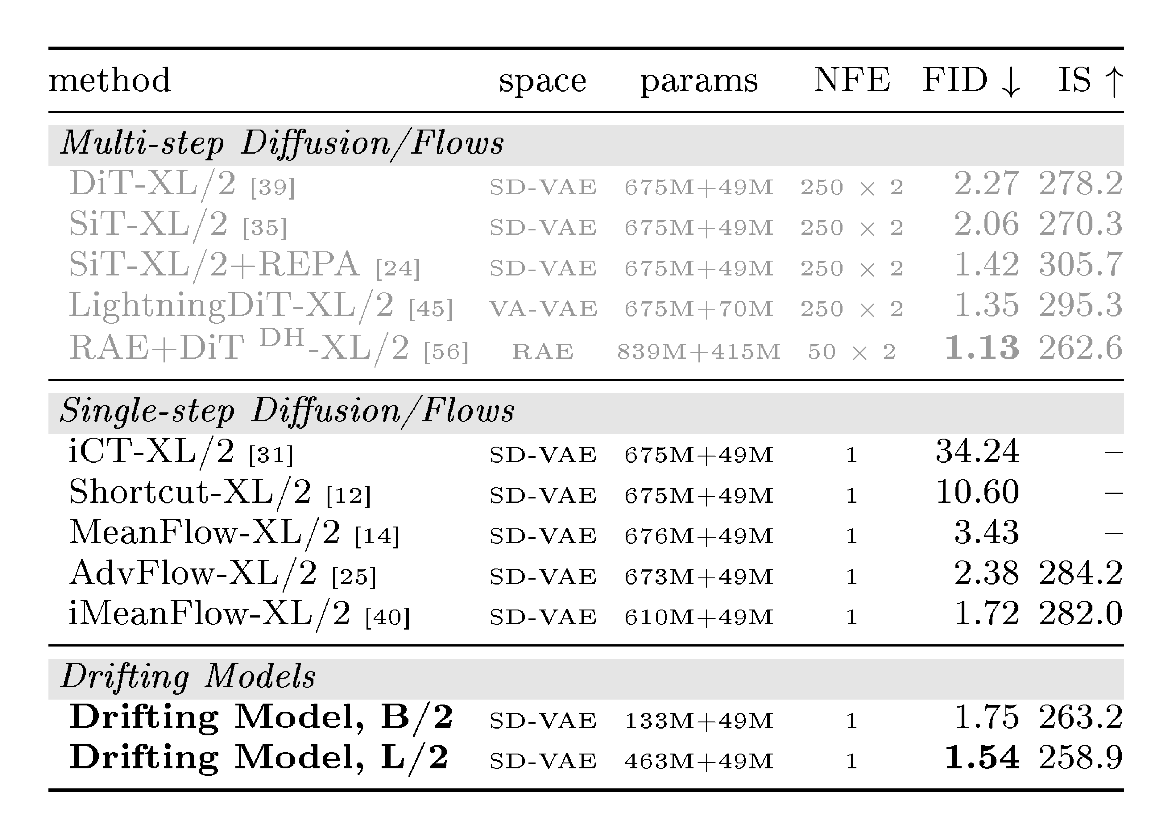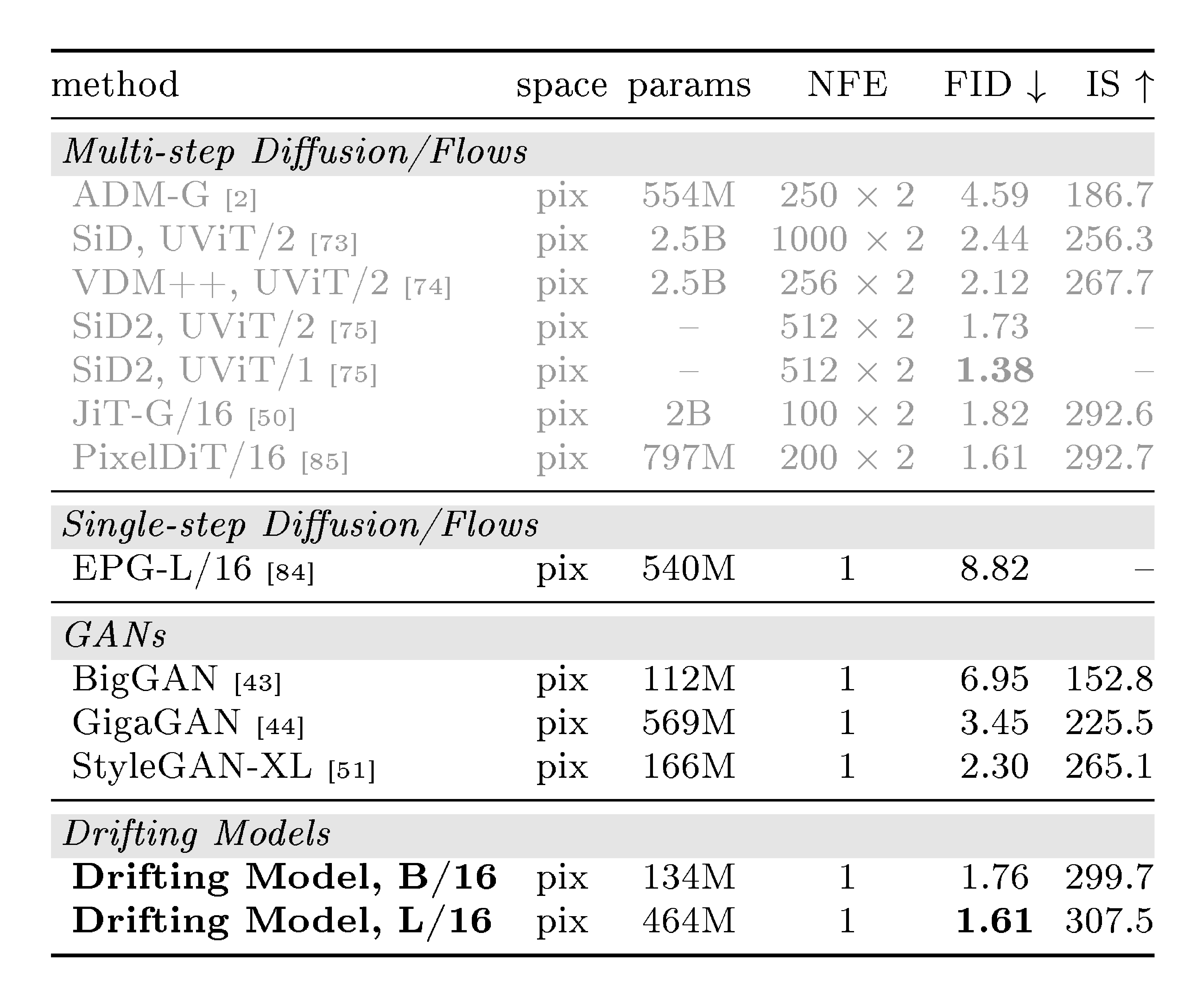 Drifting Models naturally perform single-step ("1-NFE") generation and achieve strong empirical performance. On ImageNet 256 $\times$ 256, we obtain a 1-NFE FID of 1.54 under the standard latent-space generation protocol, achieving a new state-of-the-art among single-step methods. This result remains competitive even when compared with multi-step diffusion-/flow-based models. Further, under the more challenging pixel-space generation protocol (i.e., without latents), we reach a 1-NFE FID of 1.61, substantially outperforming previous pixel-space methods. These results suggest that Drifting Models offer a promising new paradigm for high-quality, efficient generative modeling.