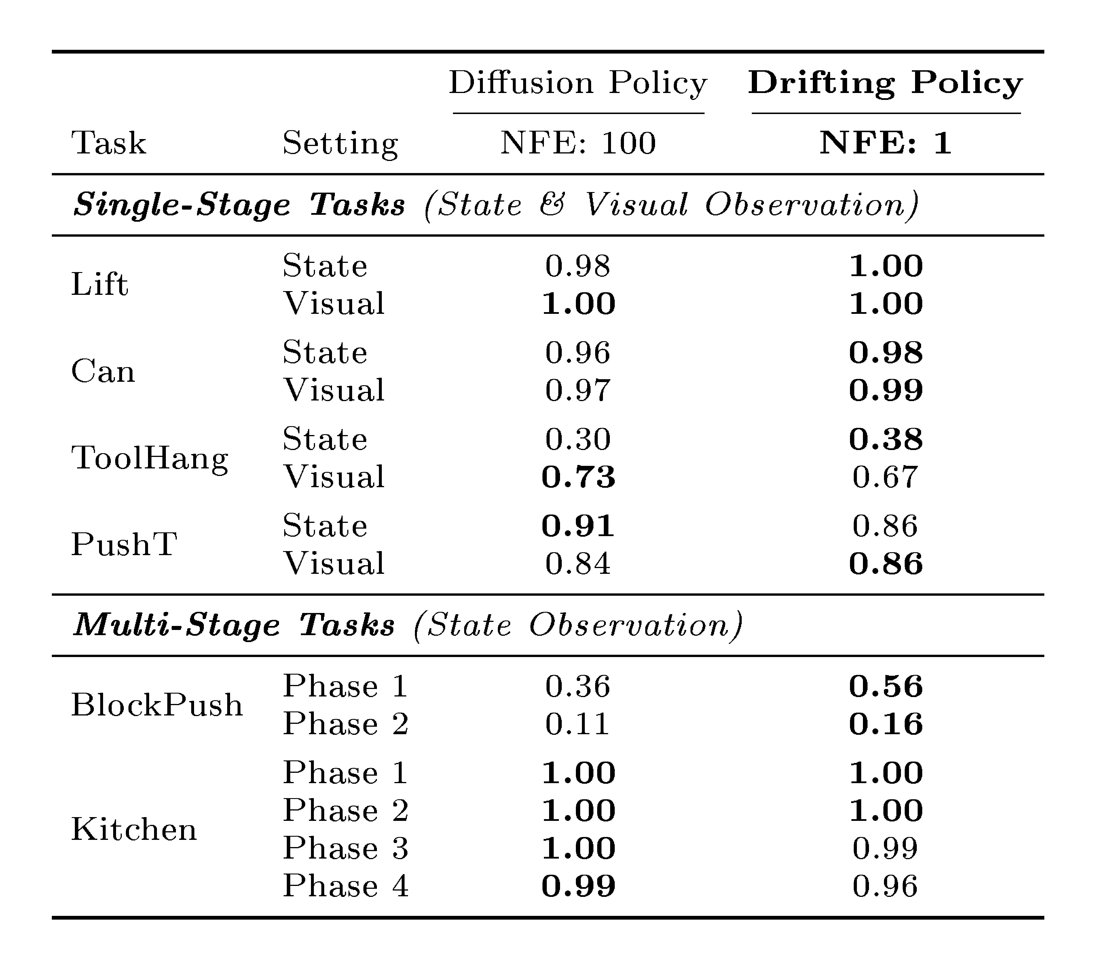 Key findings show Drifting Models excel in efficiency and quality. First, on ImageNet latent-space generation, they achieve a Fréchet Inception Distance (FID) score of 1.54 with one network evaluation, surpassing all prior one-step methods (previous best around 2-3 FID) and rivaling multi-step diffusion models that need 50+ steps. Second, in the tougher pixel-space setup without compression, they reach 1.61 FID, outperforming multi-step baselines (around 2-4 FID) and one-step rivals like GANs (2.3 FID but with 18 times more compute). Third, anti-symmetry in the drifting field proves essential, as breaking it causes failure, while larger batches of real and generated samples improve scores by 20-30%. Fourth, in robotics, replacing multi-step diffusion policies with this one-step version matches or exceeds success rates (e.g., 90-100% on tasks like manipulation) using far less computation. Finally, the method avoids mode collapse, steadily evolving distributions even from poor starts.